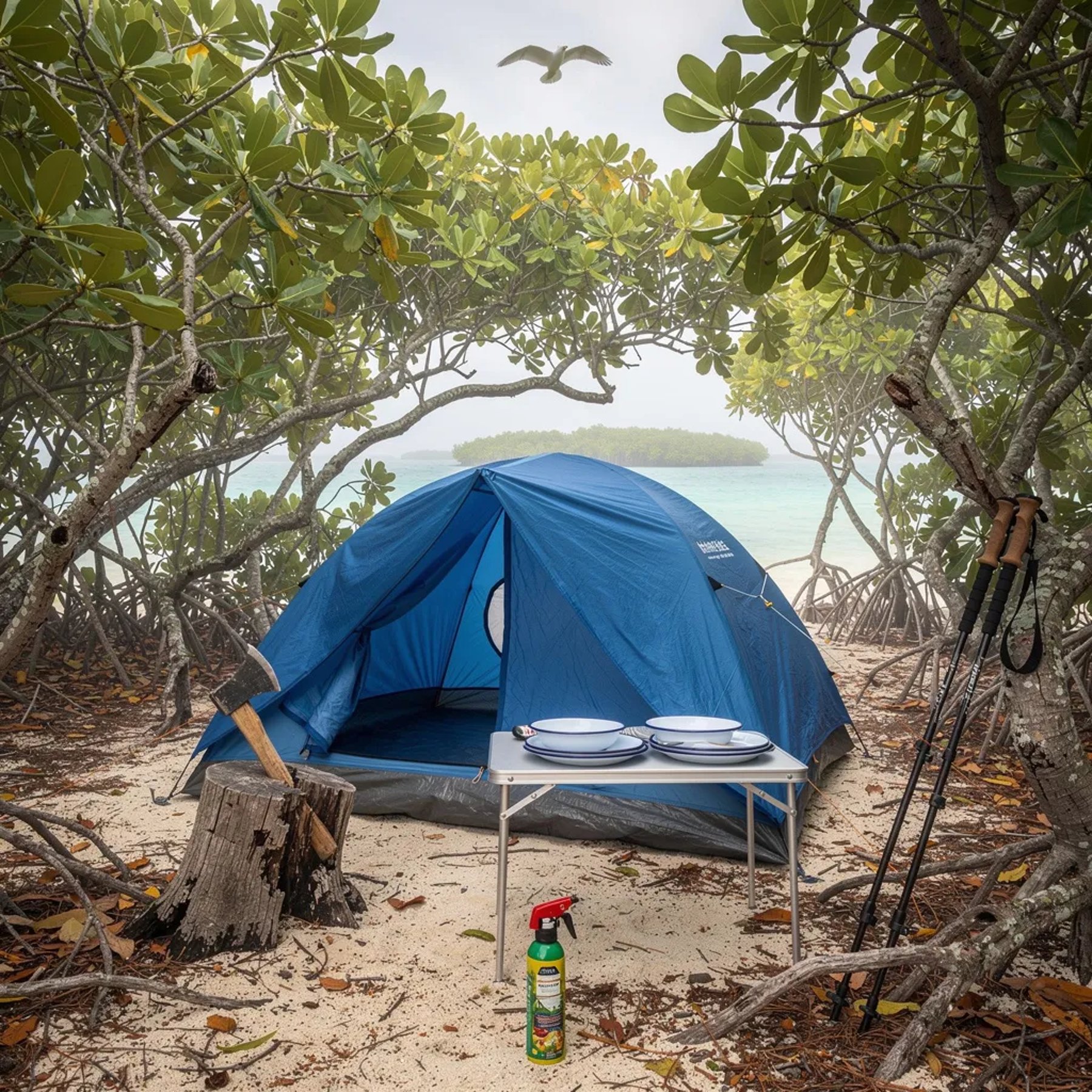A blue tent sits on soft sand under sea grape and mangrove trees, with calm bay water peeking through the leaves. The morning feels cool and misty, with gentle gray light and quiet air. An axe rests in a worn stump, while trekking poles and a can of bear spray wait nearby. A lone bird glides above the campsite.