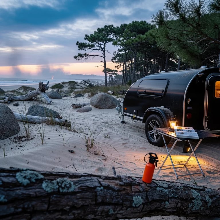 A black teardrop trailer sits on firm sand beside a pine-and-cypress grove, with driftwood and big rocks nearby. A warm lantern glow makes the campsite feel cozy in the cool blue twilight. A small table holds an open field guide, and bear spray rests by the hitch. Far away, the ocean and a smoky, hazy horizon fade under soft clouds.
