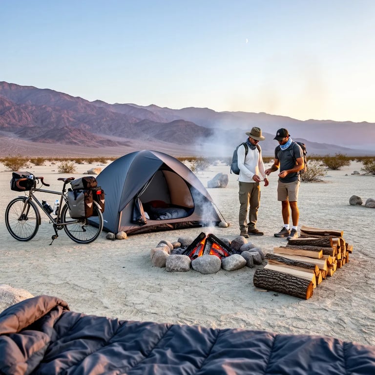 You peek out of the tent and see bright desert sunlight on cracked, dusty ground. Far away, rocky ridges and hazy mountains glow under a pale blue sky with a tiny moon. A small fire glows in a neat ring of stones, and a loaded touring bike rests nearby. Two hikers adjust their gear by the fire, getting ready for another hot desert adventure.