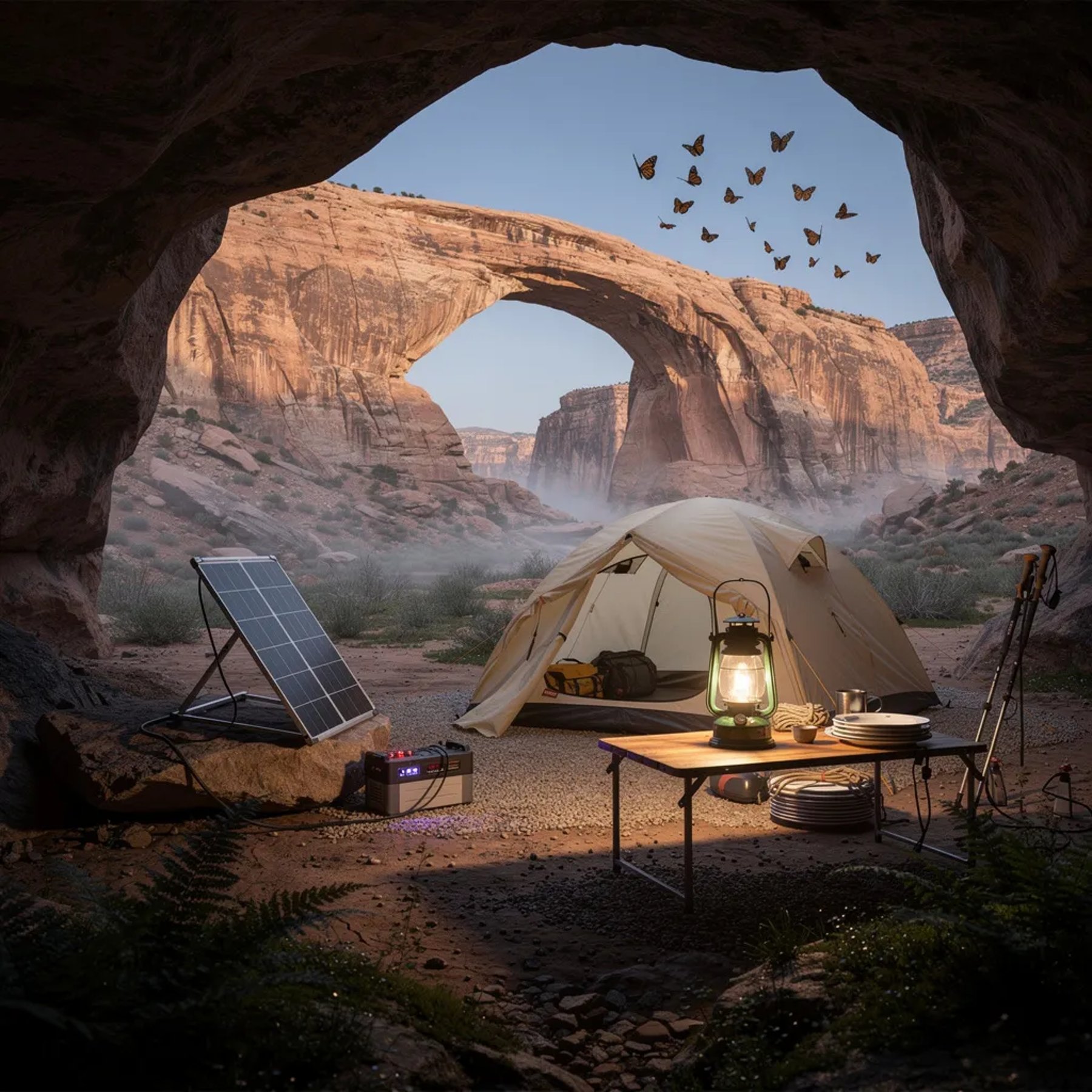 A quiet desert canyon campsite sits under a glowing sandstone arch at blue-hour dusk, seen from the shady mouth of a small cave. A beige tent rests on sandy gravel while a warm lantern shines on a little table with worn plates. Ferns grow in damp spots and a thin mist drifts through the cool air. Far above, monarch butterflies glide across the fading sky.