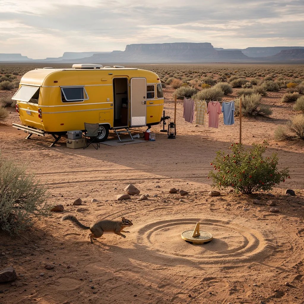 A bright yellow vintage camper sits on sandy desert ground with sagebrush and a little berry bush. Soft late-afternoon light makes the wide horizon feel calm and open. A lantern and a small sundial rest in the sand, while faded shirts sway on a clothesline. A tiny ground squirrel darts across the campsite.