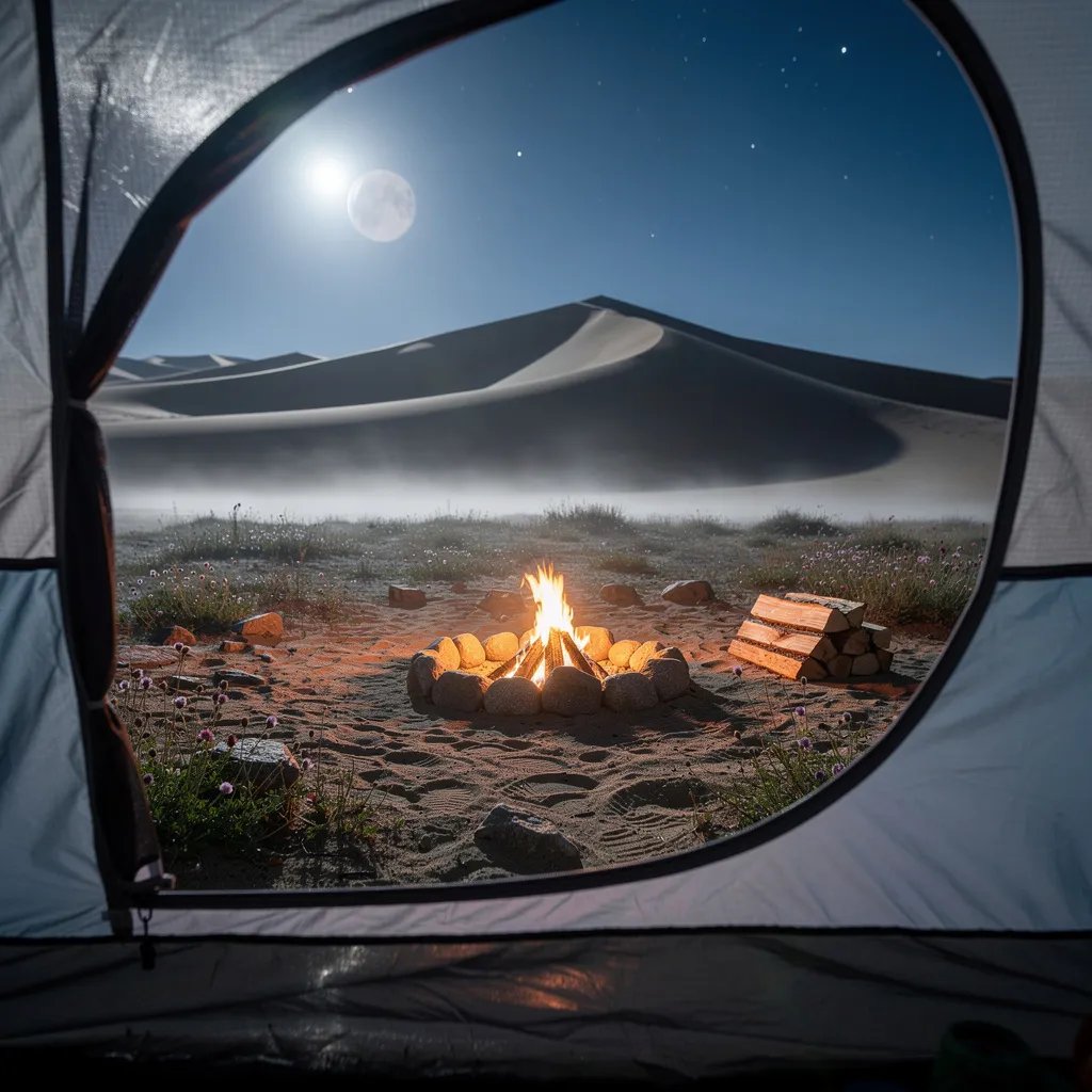 From inside a tent, you look out through a fine mesh at quiet sand dunes and scattered rocks. A small campfire glows in a stone ring, with a neat stack of firewood beside it. Cool moonlight and a few stars shine above, while thin mist drifts low over the ground and wildflowers dot the sand.