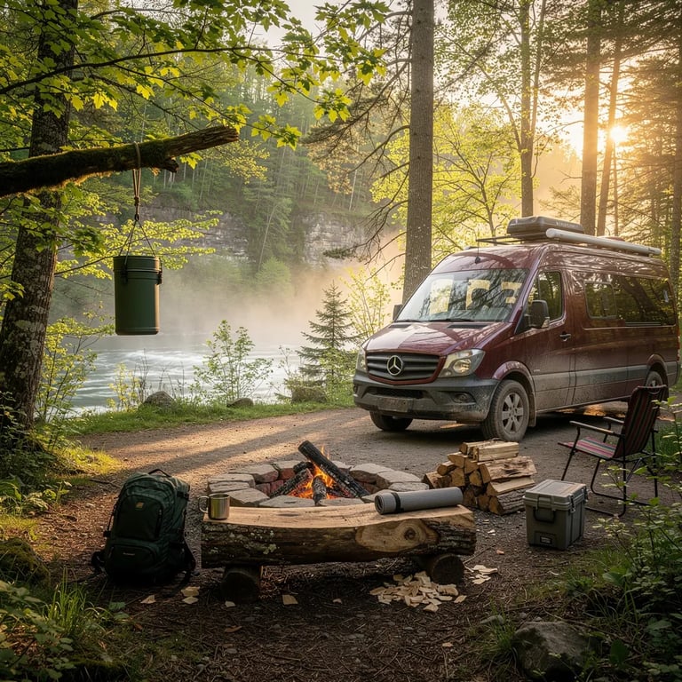 A soft spring sunrise glows through tall forest trees, with mist hanging in the distance and dew sparkling on the grass. A burgundy camper van rests in a quiet clearing beside a curving dirt path. A stone fire ring still holds warm embers, with stacked logs and a big cut log for a seat. A bear-safe food bag hangs high from a strong branch, ready for the day’s hike.