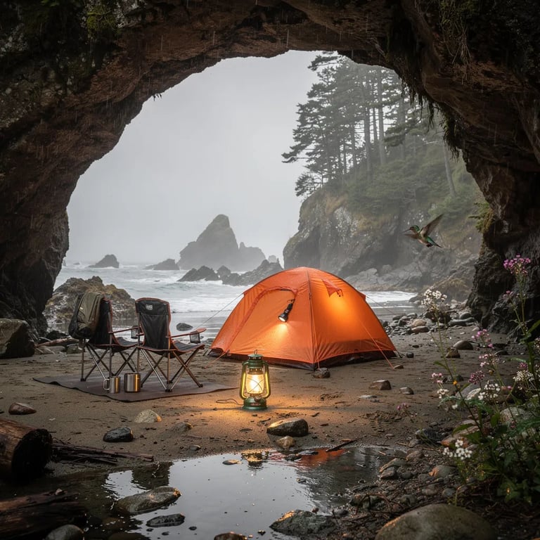 A quiet seaside cove sits under a weathered stone arch, with wet sand and tiny tidepools shining in the mist. A bright orange tent and two chairs rest by the shore while a warm lantern glows softly in the drizzle. Tall coastal trees and rugged rocks surround the camp, and a tiny hummingbird hovers near a wildflower.