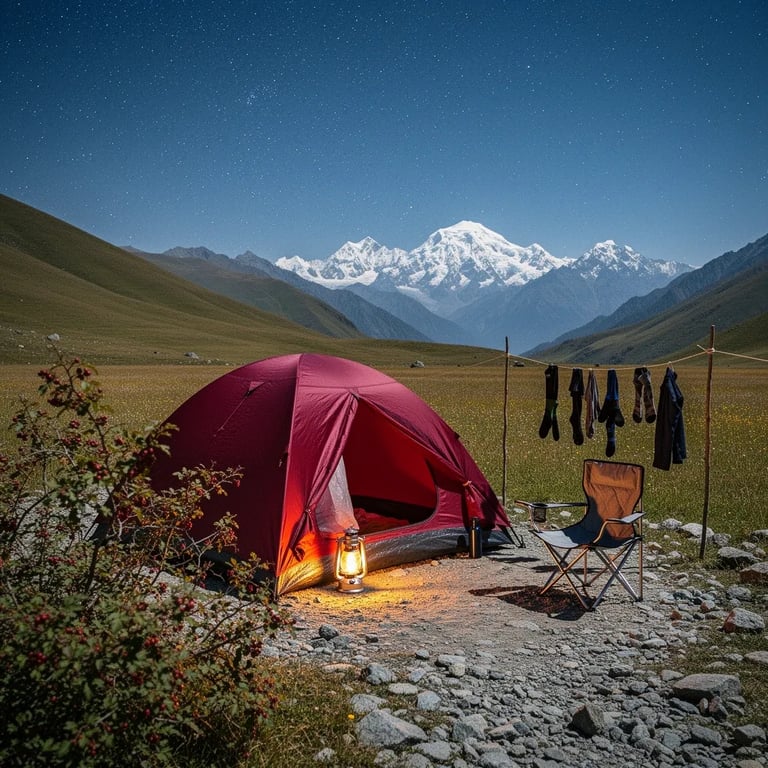 A maroon tent sits in a quiet alpine meadow, surrounded by wild grasses, little flowers, and rocky ground. A warm lantern glows by the door and makes the campsite feel cozy in the cold night air. Far away, tall mountains with a dusting of snow rest under a clear, starry sky. A small chair and a simple clothesline stand still beside a berry bush in the foreground.