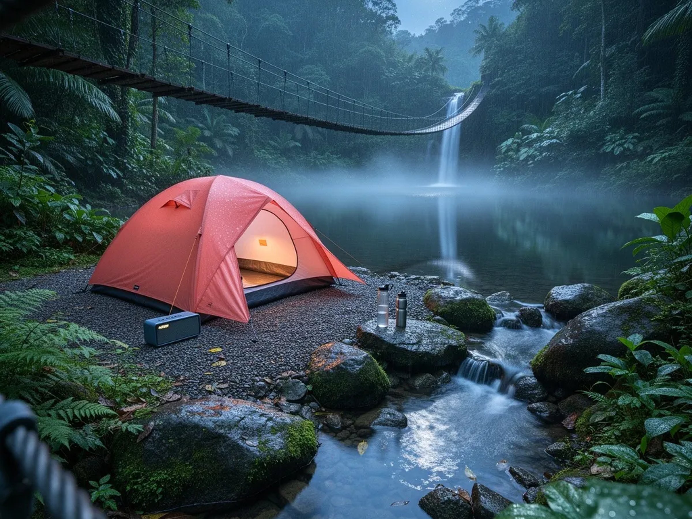 A coral-colored tent sits on a gravel patch beside a calm pond in a warm rainforest night. Moonlight and a small lantern glow shimmer on wet rocks while a tiny waterfall spills into a shallow stream. Mist floats over the water, and thick ferns crowd close around the quiet camp.