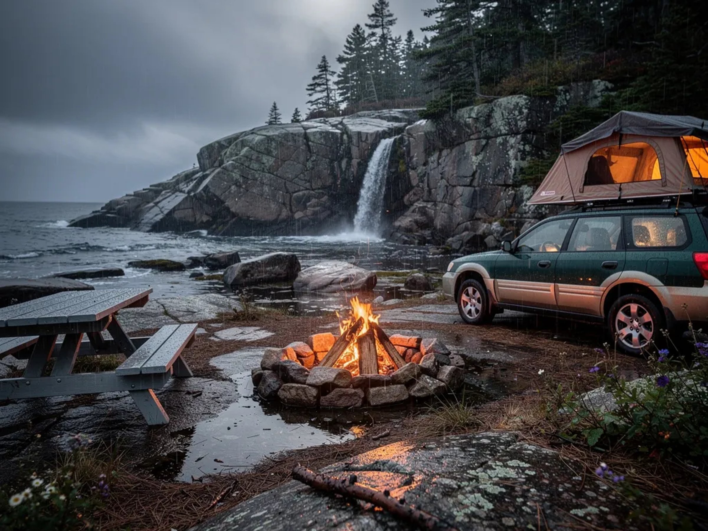 A cold, rocky Maine shoreline stretches beside a dark pine forest, with a small waterfall slipping into shiny tide pools. A green-and-tan Subaru sits by camp with a rooftop tent glowing warm in the misty rain. A little campfire and a weathered picnic table make the wet night feel cozy and brave.