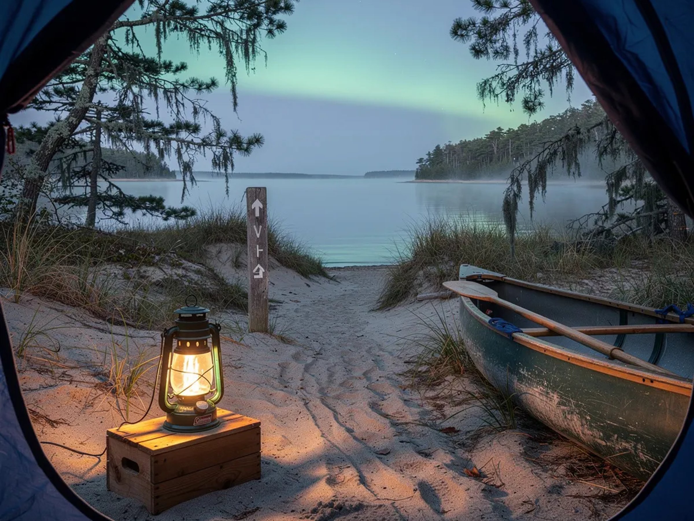 A blue tent sits in the sandy dunes by a quiet inlet at dusk, with pines and tall grass swaying in the cold wind. A warm lantern glows on a wooden crate, lighting the sand like a small campfire. A canoe rests nearby, and a weathered trail marker stands by the path. Far out over the water, faint green lights shimmer under the stars.