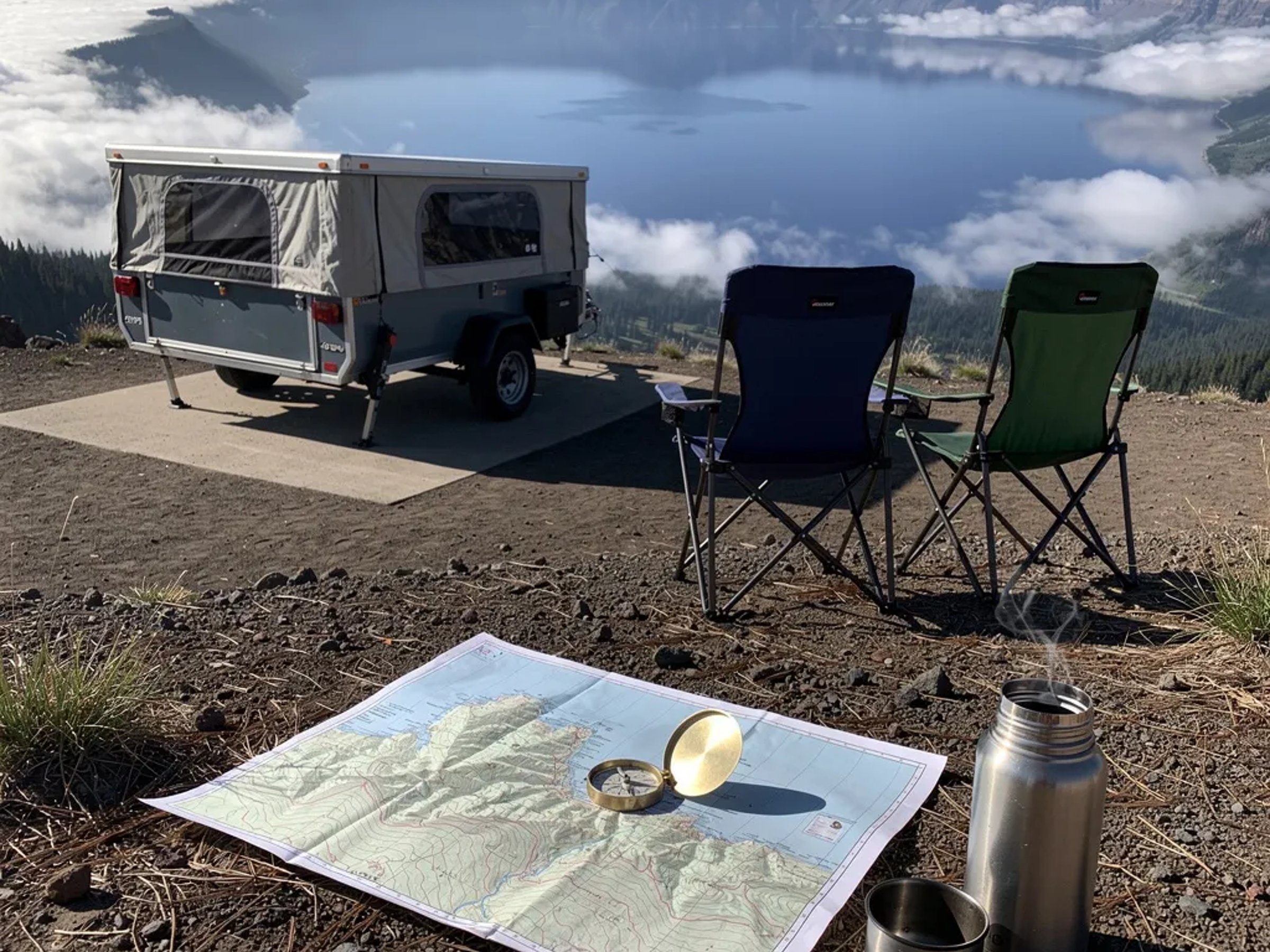 On a sunny overlook, a gray-and-blue pop-up camper sits on dusty volcanic ground sprinkled with pine needles and stones. Two camp chairs face the wide crater views, where low clouds rest in the valleys below. A topo map and brass compass lie on the dirt beside a steaming thermos, ready for a day of exploring.