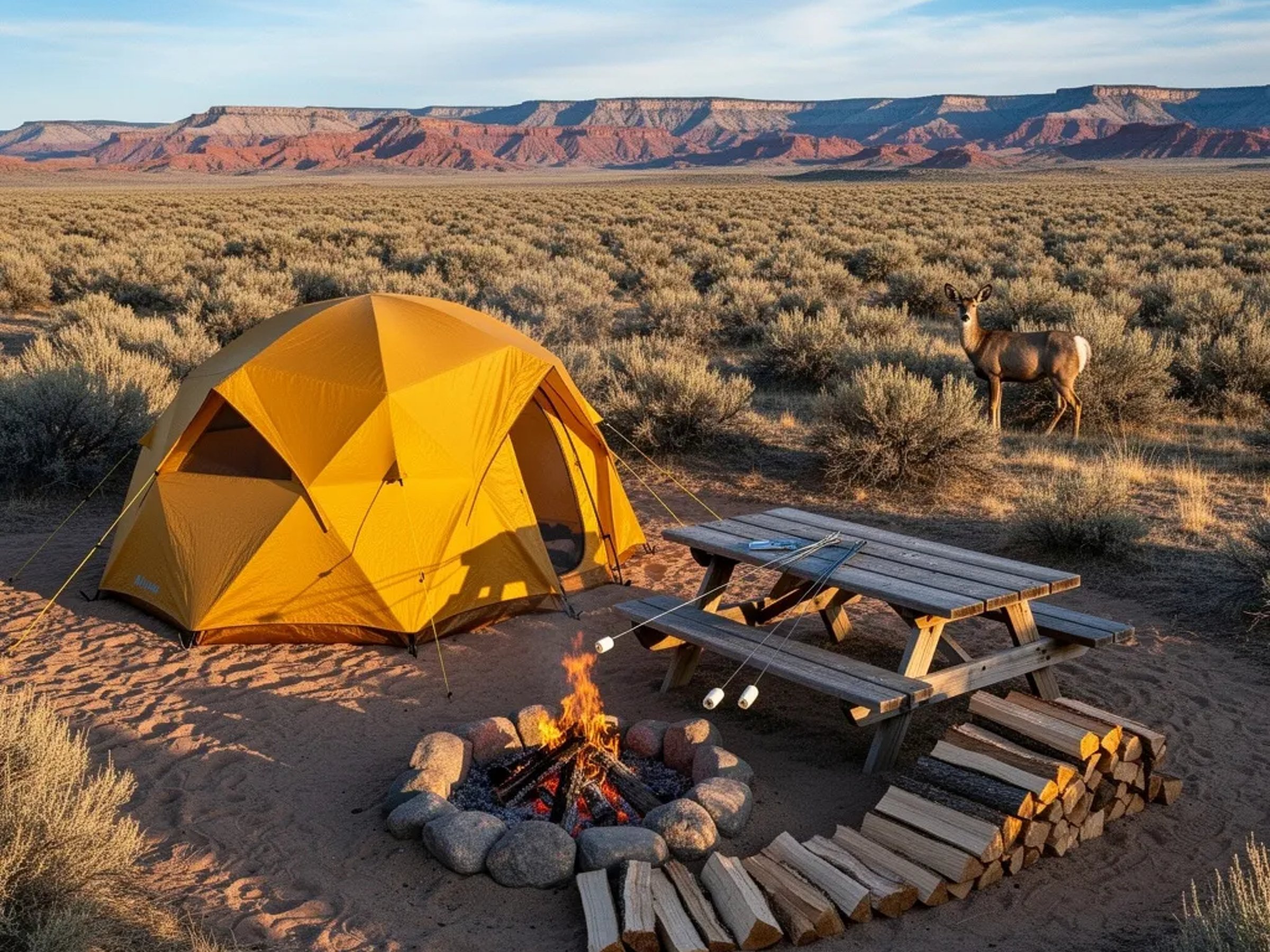 A mustard-yellow dome tent sits on sandy desert ground, surrounded by sagebrush and wide mesas in the distance. Warm golden sunlight makes long, soft shadows in the dusty air. A picnic table and a stone-ring fire with marshmallows roasting make it feel cozy. Far away, a mule deer stands quietly near the brush.