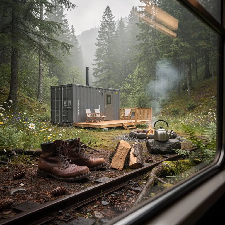 A quiet campsite sits in a lush forest valley, with ferns, wildflowers, and wet leaves on the ground. A small metal cabin with a wooden deck stands near a narrow train track, glowing softly in the misty morning. Sunbeams slip through the clouds, lighting a fire ring with a kettle, split logs, and hiking boots warming by the embers.