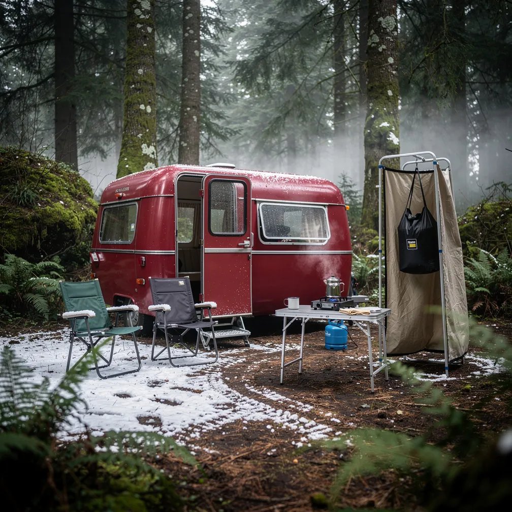 A rust-red vintage caravan sits in a quiet clearing deep in an evergreen forest. The ground is wet and dusted with fresh snow, and a soft fog hangs between the trees. Two camp chairs wait by the door, and a little stove makes coffee while a small shower screen stands nearby.