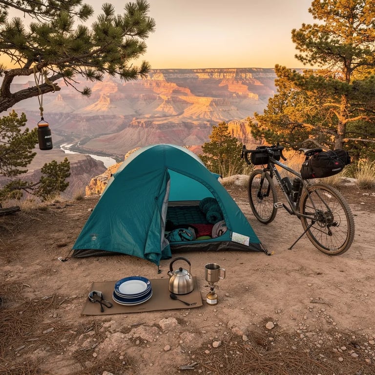 A teal tent sits on dusty ground under tall pine trees, with the Grand Canyon glowing red in the distance. Warm sunset light makes long, soft shadows and the air feels calm and breezy. A touring bike rests beside the tent, and a bear canister hangs from a strong branch. Simple plates and a small kettle are set out, ready for supper.