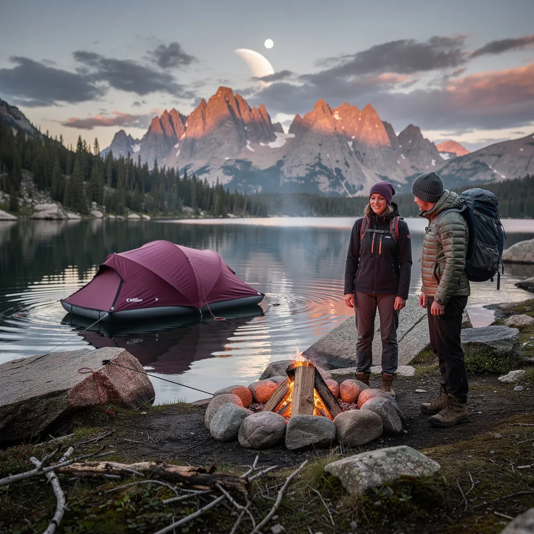 A calm alpine lake shines like a mirror, with smooth granite rocks and scattered twigs along the shore. A plum-colored floating tent bobs near the bank while a small campfire glows and sends thin smoke into the cool, dim sky. Far away, jagged mountain peaks catch a soft warm light, making the whole campsite feel quiet and magical.