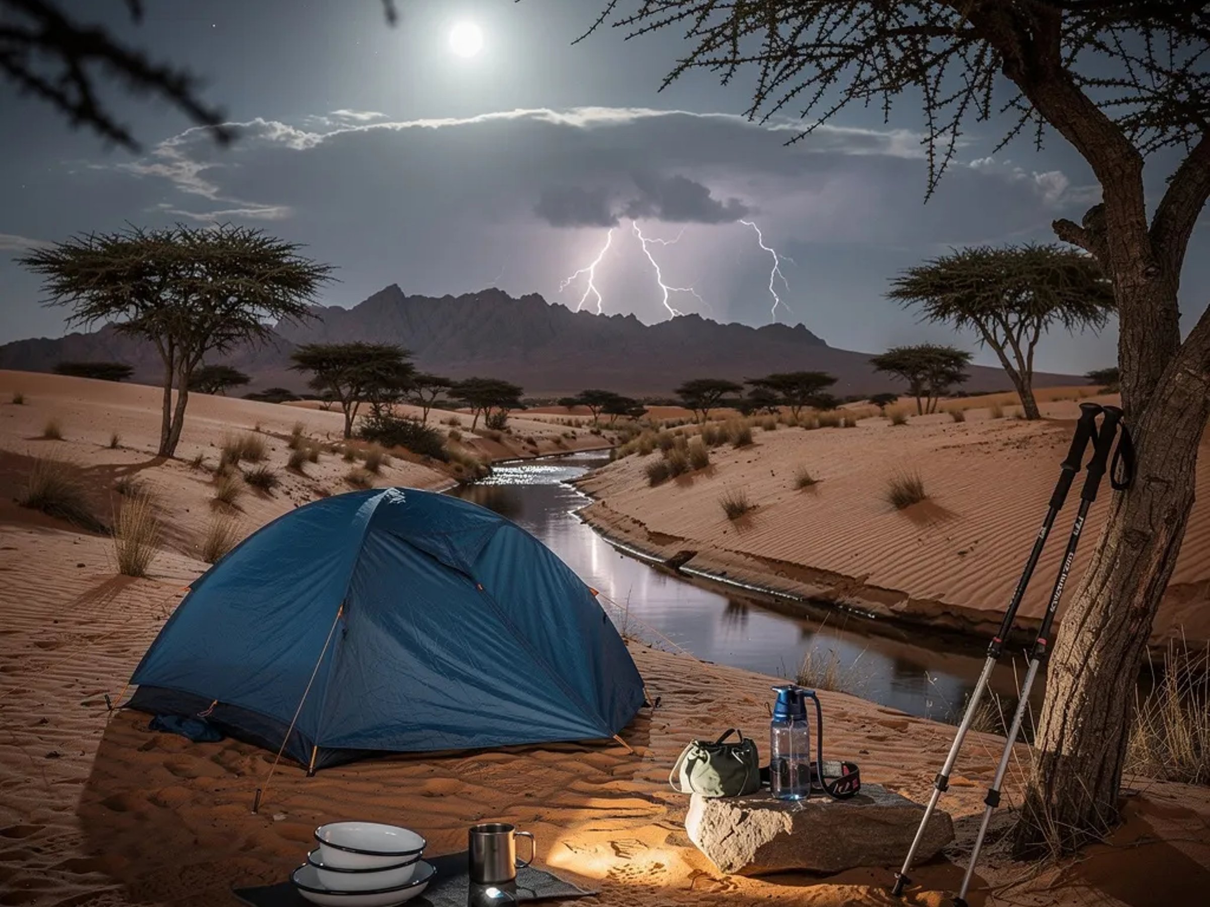 A steel-blue tent rests in a quiet sandy valley by a small stream, with a few acacia trees nearby. Cool full moonlight paints sharp shadows, and the desert feels wide and still. Far away, lightning flashes behind low mountains, lighting up the clouds for a moment.