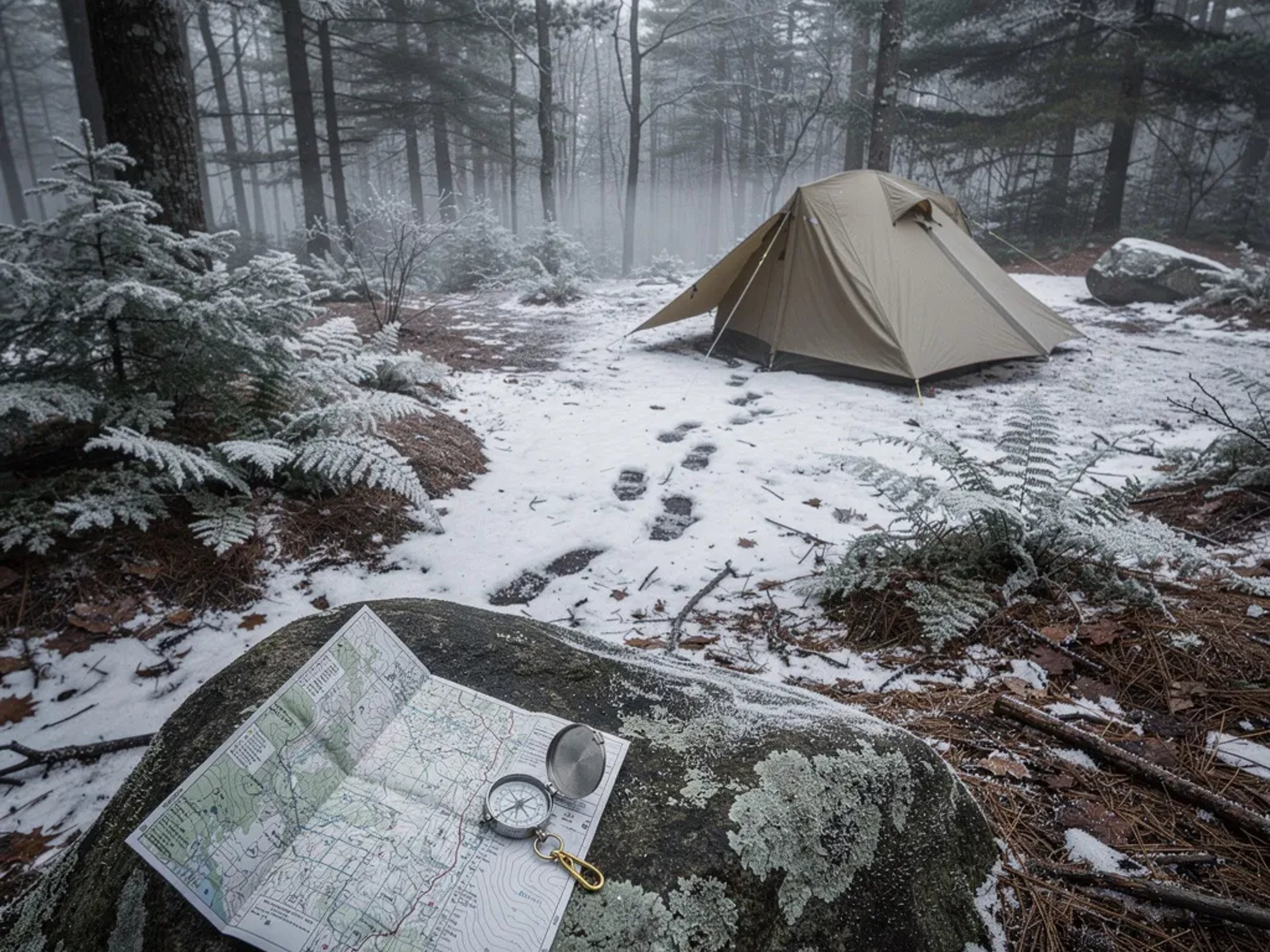 A quiet winter campsite sits in a mixed evergreen forest, with patchy snow and brown leaves on the ground. A khaki tent rests in a small clearing below a rocky lookout, with a huge boulder nearby. Frosty ferns and faint animal tracks add to the hush, while a map and compass lie on a flat rock under the soft, gray sky.