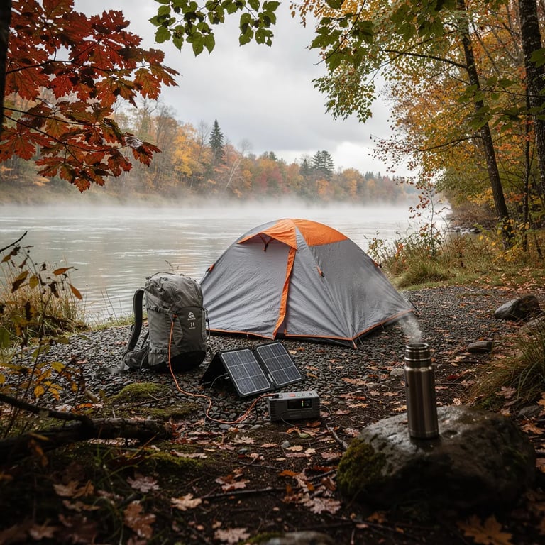A grey-and-orange tent sits on a small gravel bar beside a calm river, with soft mist floating above the water. Bright fall leaves frame the campsite, and the ground looks damp from the cool morning air. A backpack and a little solar panel rest nearby, while a steaming thermos makes the scene feel warm and cozy.
