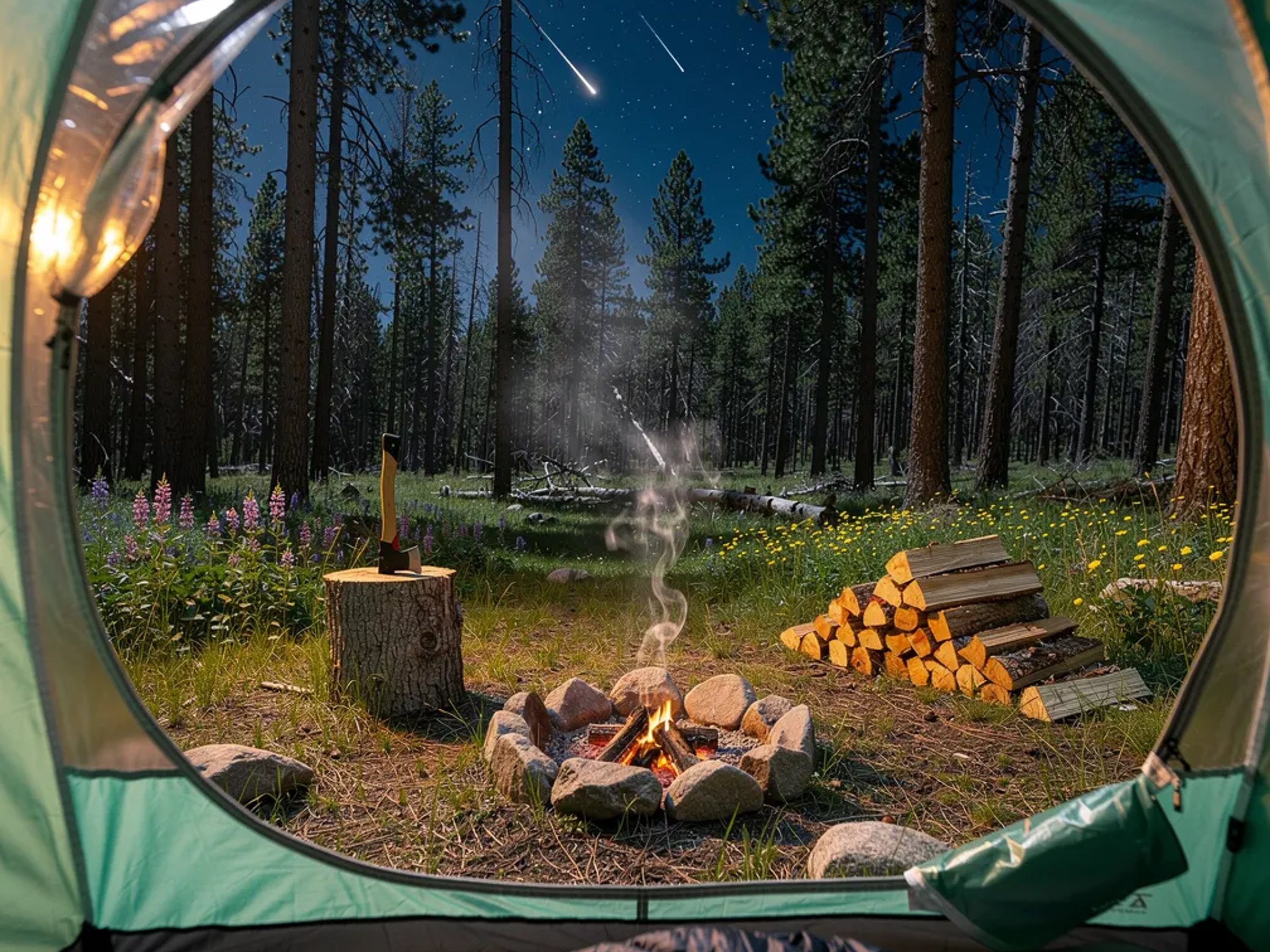A quiet clearing in the pines glows with warm firelight and cool moonlight. A mint-green bubble tent sits near a stone fire ring, with neat stacks of wood and an axe stuck in a stump. Wildflowers dot the grass as thin smoke rises from the embers. Above the treetops, the sky is packed with stars and a few bright meteors streak by.