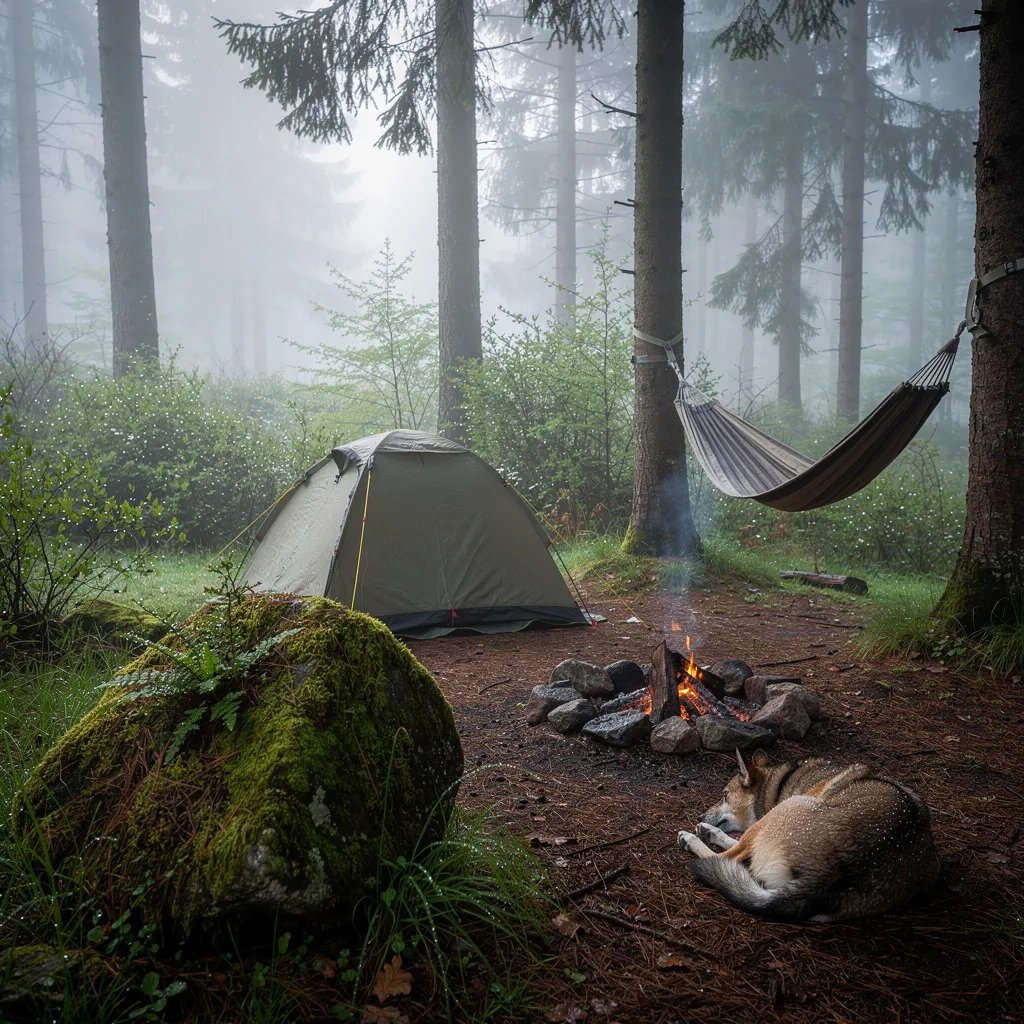 A soft spring fog drifts through tall pine trees, and dew sparkles on the damp forest floor. Below, a small tent and a hammock sit in a quiet clearing beside a mossy boulder. A tiny stone fire pit gives off a thin curl of smoke while a dog sleeps nearby, making the whole camp feel calm and cozy.