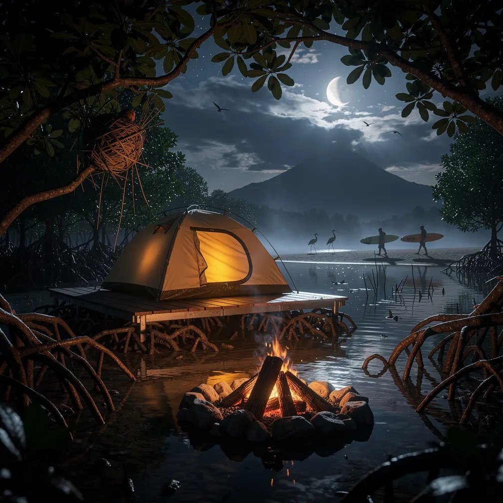 A warm tent glows on a small wooden platform above a quiet mangrove lagoon. Moonlight and a tiny campfire shine on the twisted roots and shiny water, while dark mountains sit far away. A bird nest rests in the branches, and you might spot surfers and wading birds as shadows in the distance.