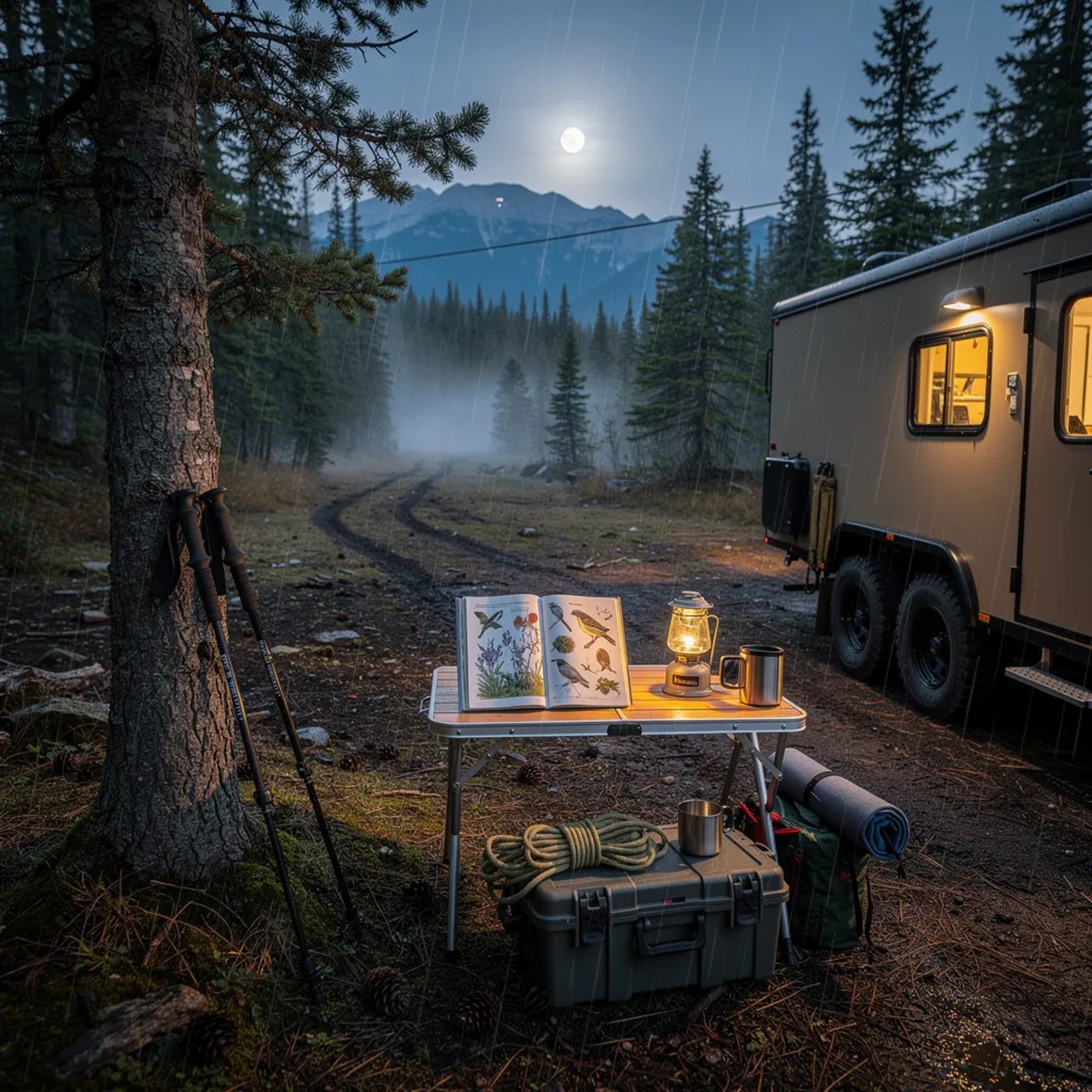 A quiet clearing in the pine trees sits under a cool blue moonrise, with a soft mist drifting through the air. A small khaki tiny house on wheels glows warmly, making the wet ground and pine cones sparkle. Nearby, a camp table holds an open nature book and neatly stacked gear, while trekking poles rest against a spruce. Light sleet falls, and the whole place feels calm and wild.