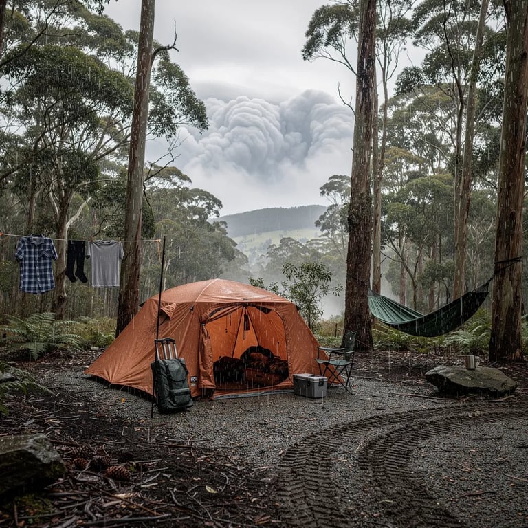 A cozy terracotta tent sits in a quiet forest clearing, surrounded by tall eucalyptus and pine trees. The ground is wet and scattered with pine cones, and light sleet and drizzle drift through the cool air. A hammock hangs between two trees while a small clothesline flutters nearby. Above the treetops, dramatic clouds break open in patches, making the campsite feel wild and peaceful.
