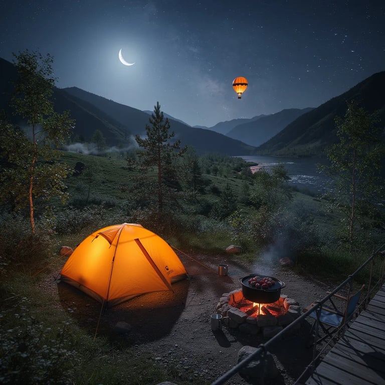 A bright orange tent glows in a quiet mountain valley under a thin moon and a sky full of stars. A small campfire warms a dutch oven, with red coals shining on the ground. Far away, a tiny hot-air balloon light floats over the dark hills.