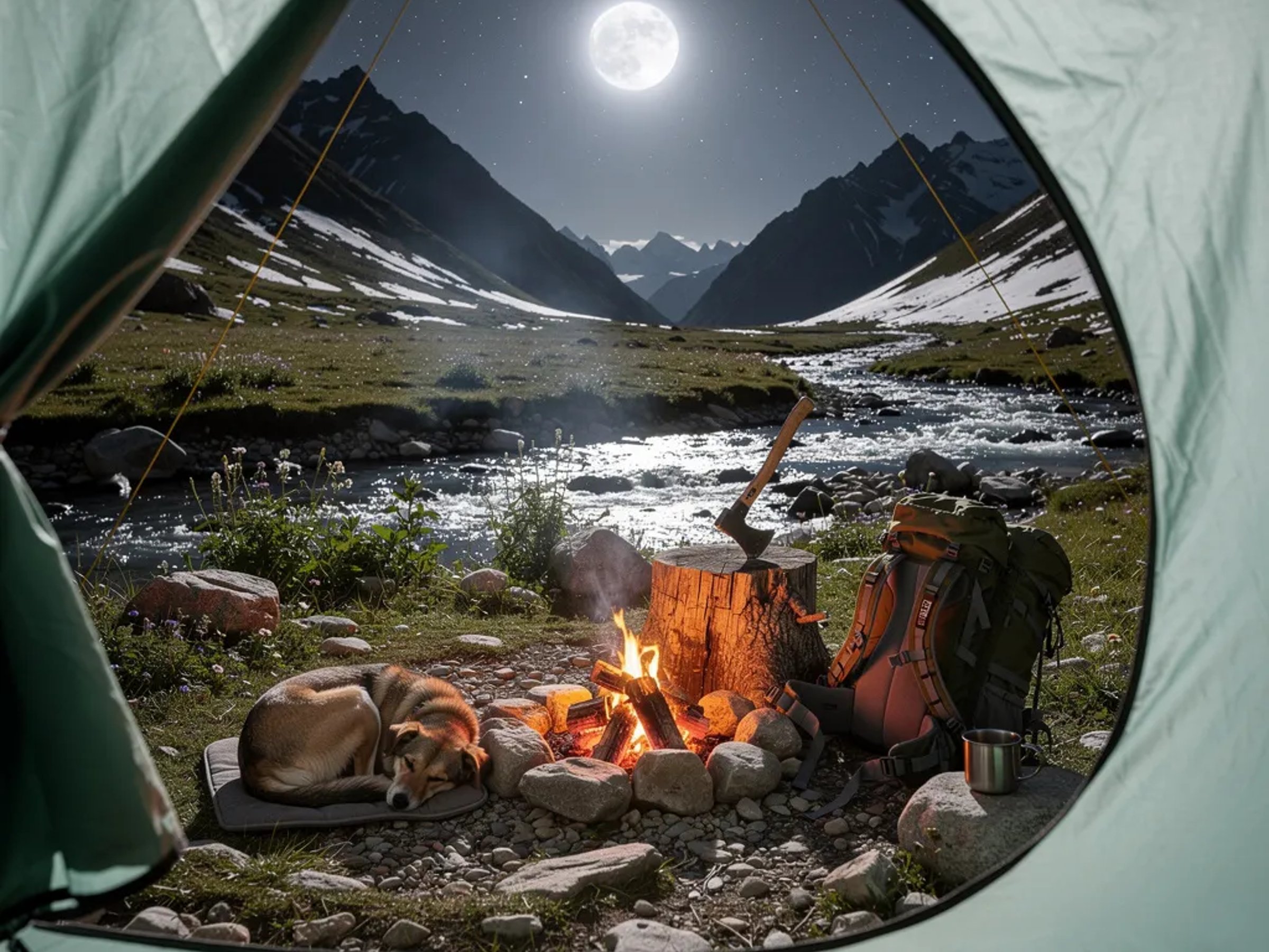A bright full moon shines over a chilly flower-filled valley, with a rocky stream nearby. From inside the open tent, you can see a small campfire glowing and sending up a thin ribbon of smoke. A sleepy dog is curled up close to the warmth, while backpacks and a metal mug rest on the stony ground. An axe sits stuck in an old stump, making the campsite feel wild and adventurous.