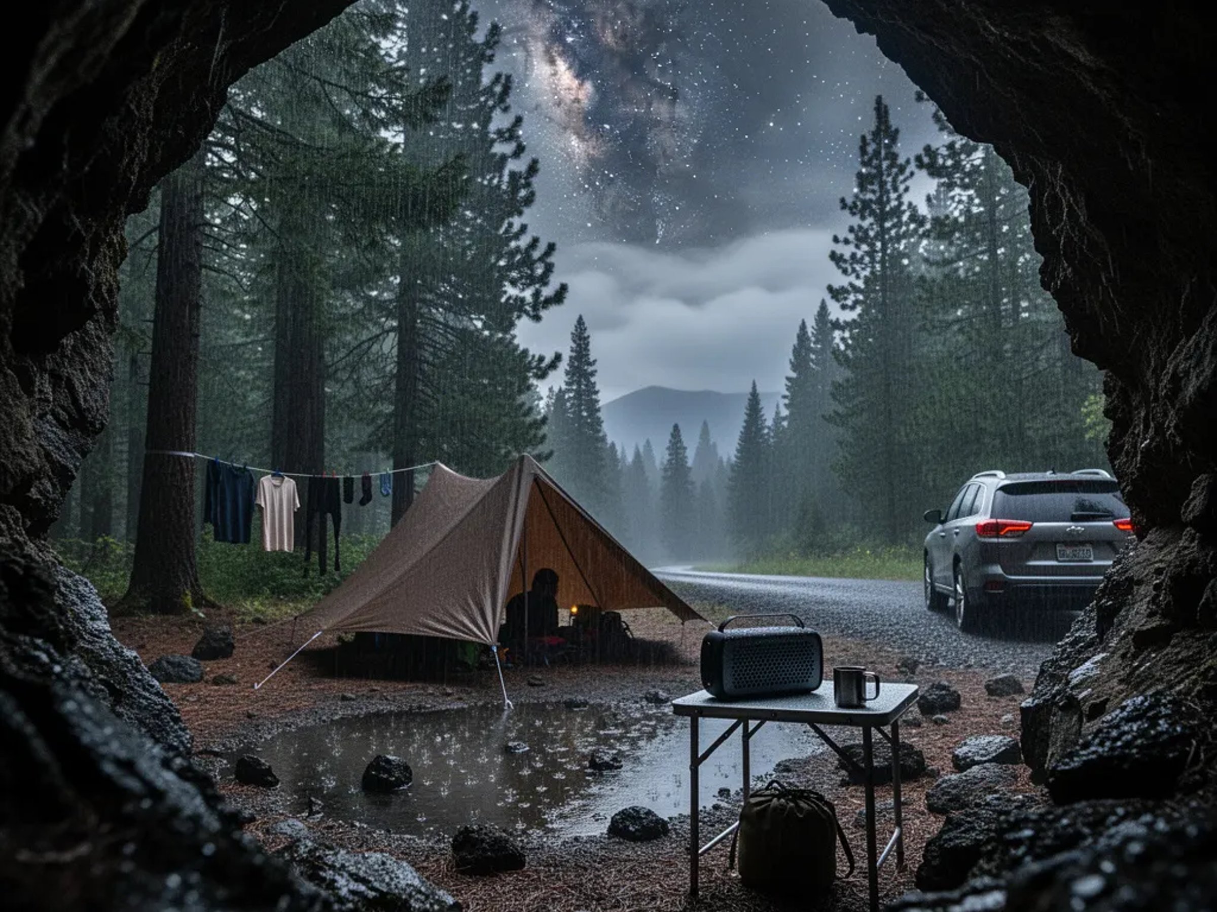 A rugged stone arch frames a rainy forest campsite, where wet pine needles and dark volcanic rocks shine in the puddles. A low brown tarp shelter glows softly from a headlamp, with damp shirts and socks hanging nearby. Clouds drift apart to show faint stars and a hint of the Milky Way above the quiet clearing.