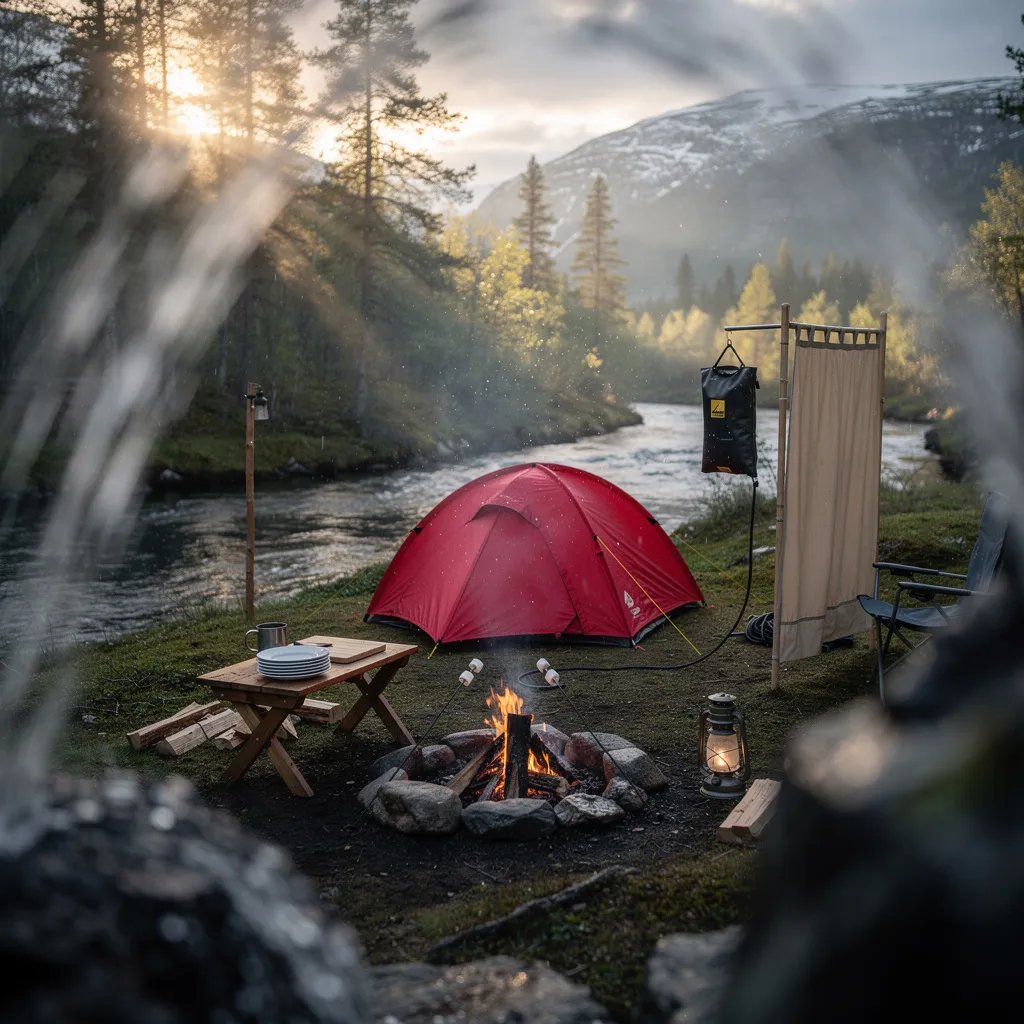 A red tent sits on soft, mossy ground beside a clear river as the sun rises through tall pine trees. A waterfall splashes nearby, sending cool mist into the air. A small campfire glows with marshmallows roasting, and a lantern and camp table wait for breakfast. The whole place feels quiet, fresh, and full of adventure.