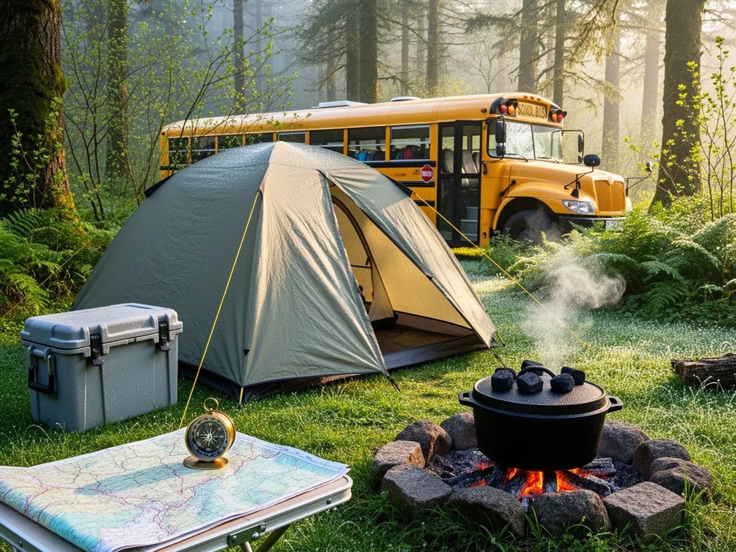 A cozy tent and cooler sit on soft, wet grass in a quiet green forest. Morning light shines gently through the trees, making the dew sparkle. A map, compass, and dutch oven over warm coals wait for the day’s adventure. In the background, a yellow school bus turned camper rests among the misty trees.