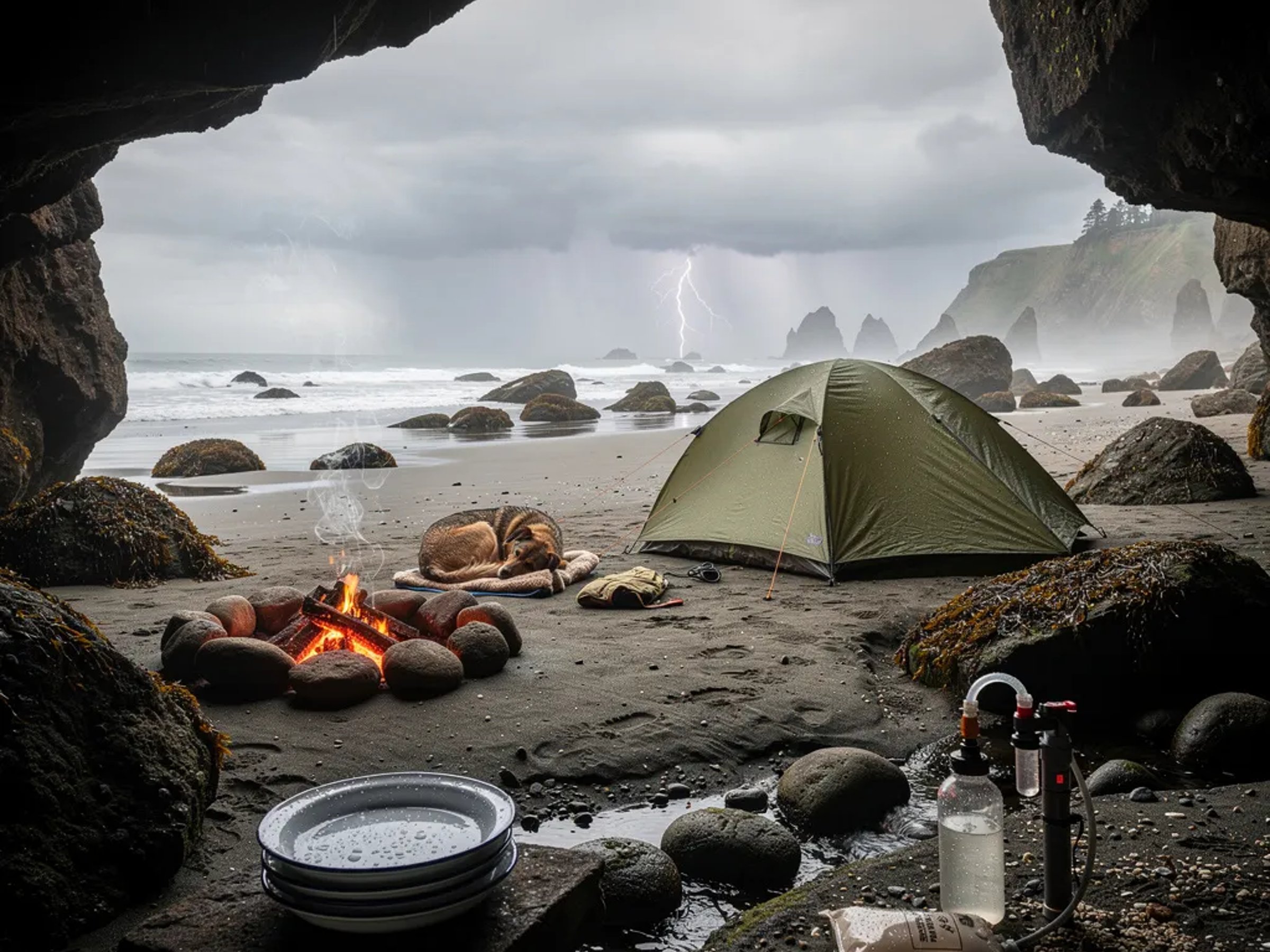 A cozy tent sits on wet sand by dark, tide-washed rocks, seen from the mouth of a little sea cave. The ocean air is misty and gray, and the surf sounds close. A small fire glows while a dog sleeps beside it, and clean camp dishes rest on a flat rock. Far out at sea, rain clouds drift by with tiny flashes of lightning.