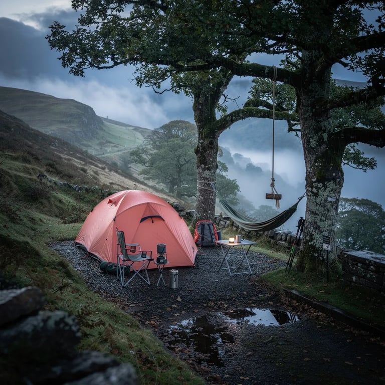 A coral tent sits on wet gravel beside a windy hillside, with mist sliding through the valley in cool blue light. A hammock hangs between two trees, and a simple rope swing dangles from a thick branch. Everything looks fresh from the rain, quiet, and a little magical.