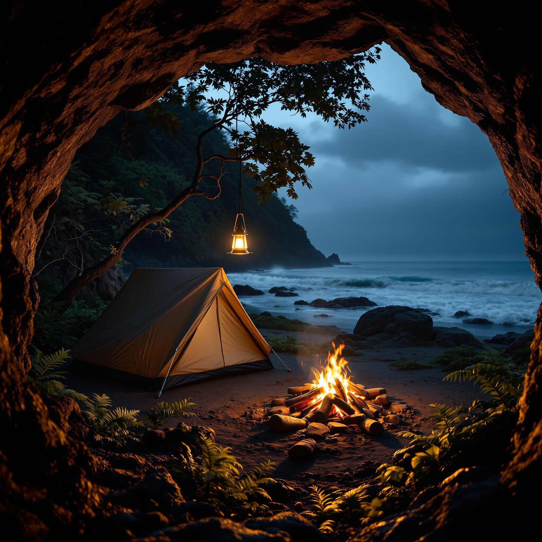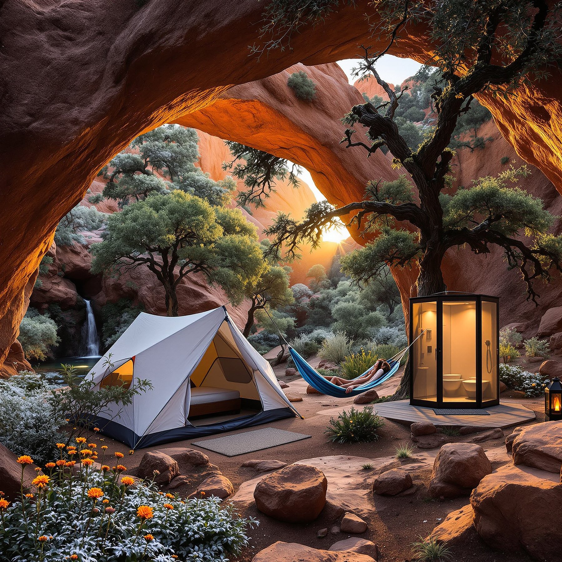 This cozy campsite sits under a giant red rock arch, surrounded by trees and bright flowers. There’s a comfy tent, a relaxing hammock, and even a cool shower right by a waterfall. The sun peeks through the rocks, making everything glow.