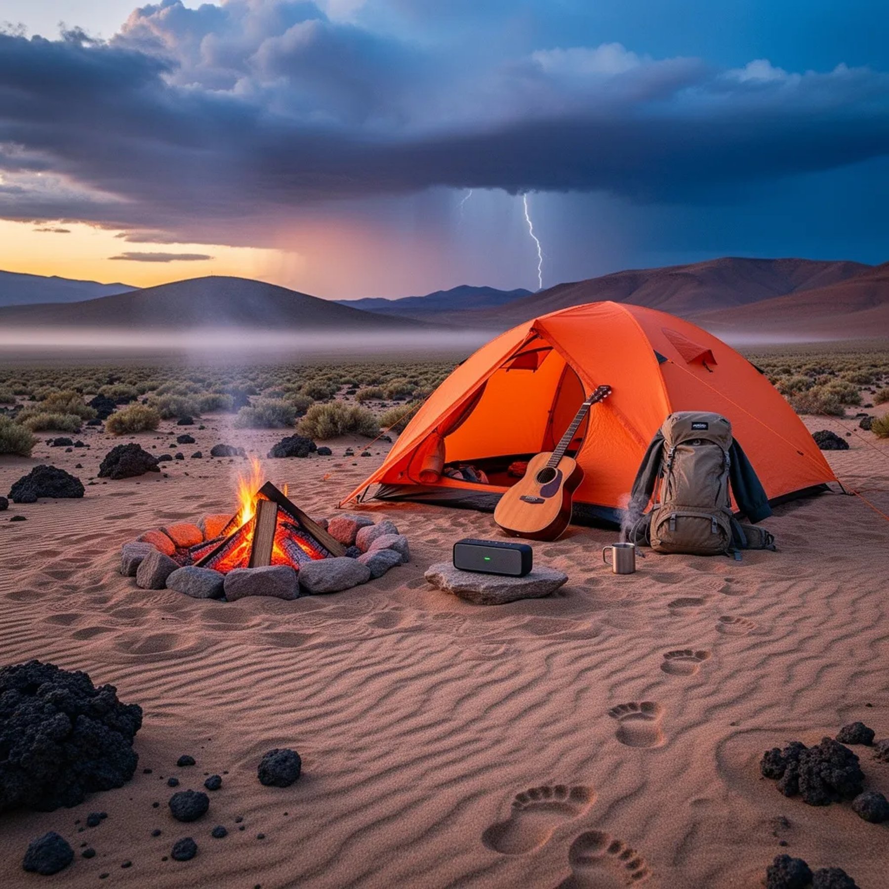 A bright orange tent glows on the sandy desert floor, framed by a rocky cave. Soft dusk light colors the sky blue and orange as storm clouds fade away. A small campfire burns beside a guitar, backpack, and metal mug, with footprints leading into the quiet camp.