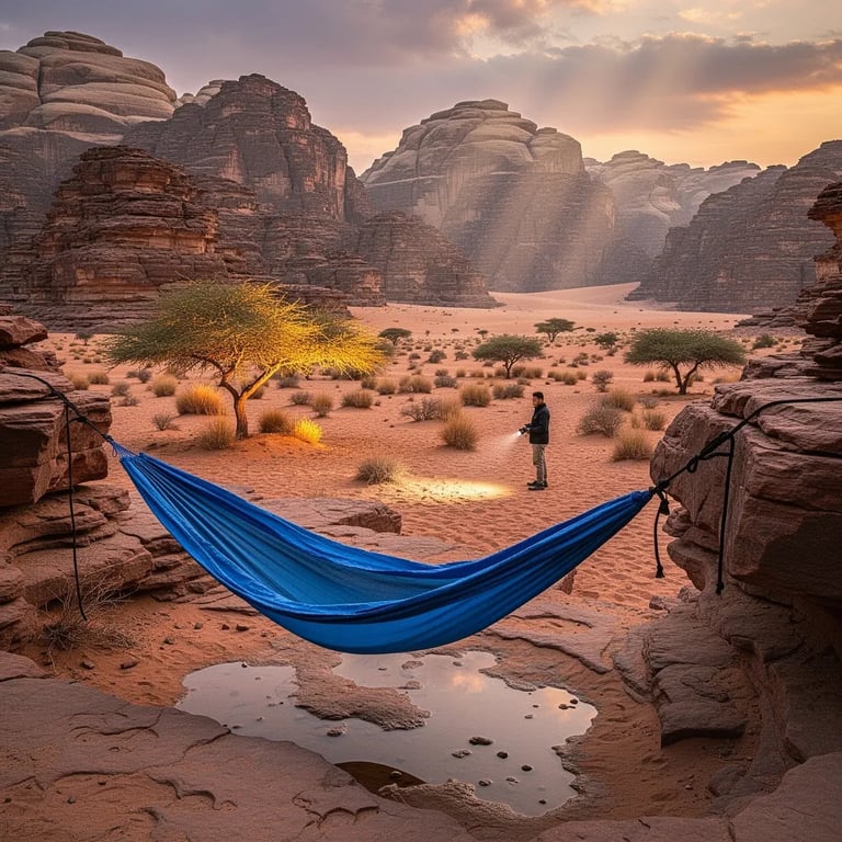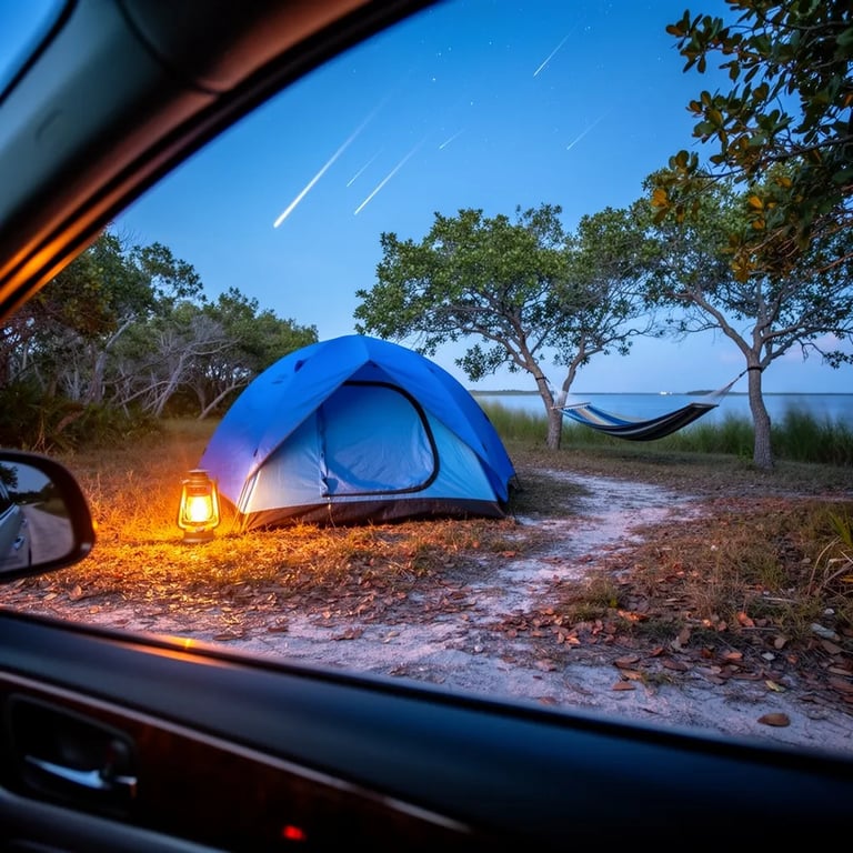 A cozy blue tent glows softly in the twilight, with a warm lantern lighting the leaves on the ground. A hammock hangs between two small trees, gently swaying in the breeze. Above, a darkening blue sky sparkles with faint shooting stars.