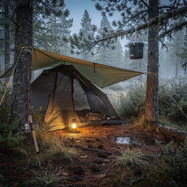 A quiet Montana campsite sits in a damp pine clearing, with cool blue twilight and a soft mist in the air. An olive-green tarp shelter glows warmly from a flashlight inside, making the woods feel cozy and safe. A fishing rod leans on a tree, and a bear-safe food canister hangs high above the wet grass.