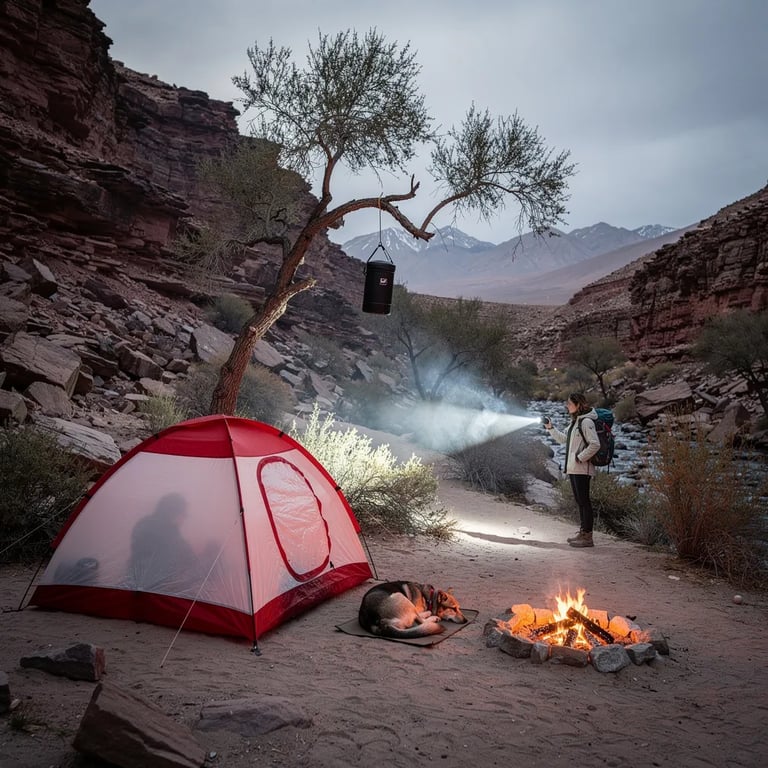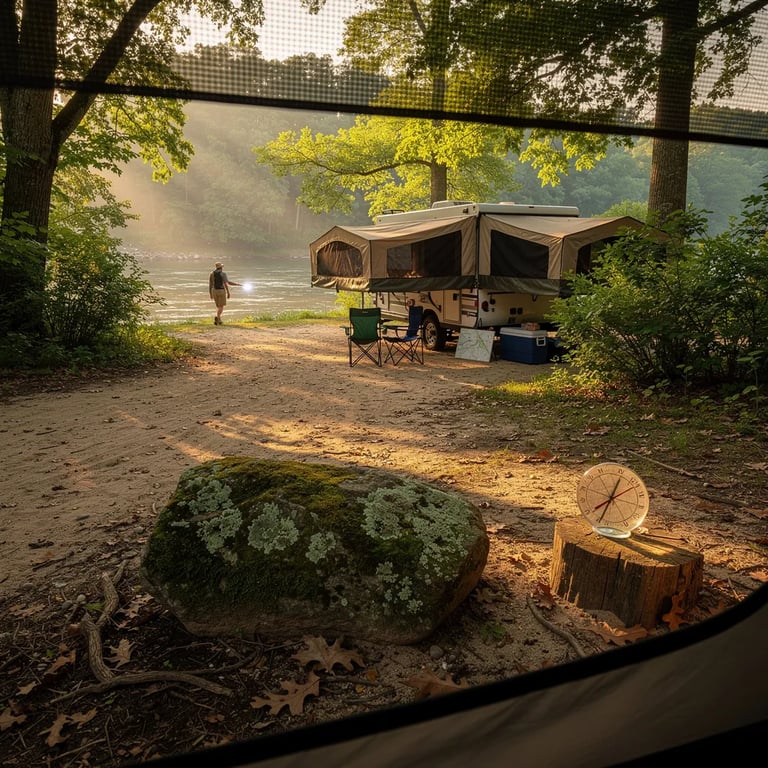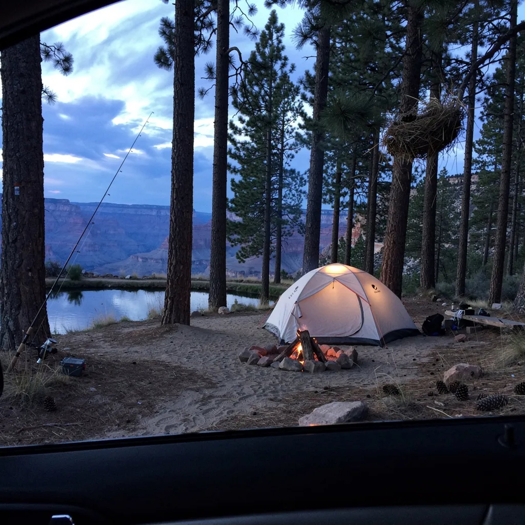 A white dome tent sits under tall pine trees as blue twilight settles in. A small pond glows nearby, and a stone fire ring holds warm, sleepy embers. A fishing rod leans on a tree, while the dark canyon rim rests far off under cloudy skies.