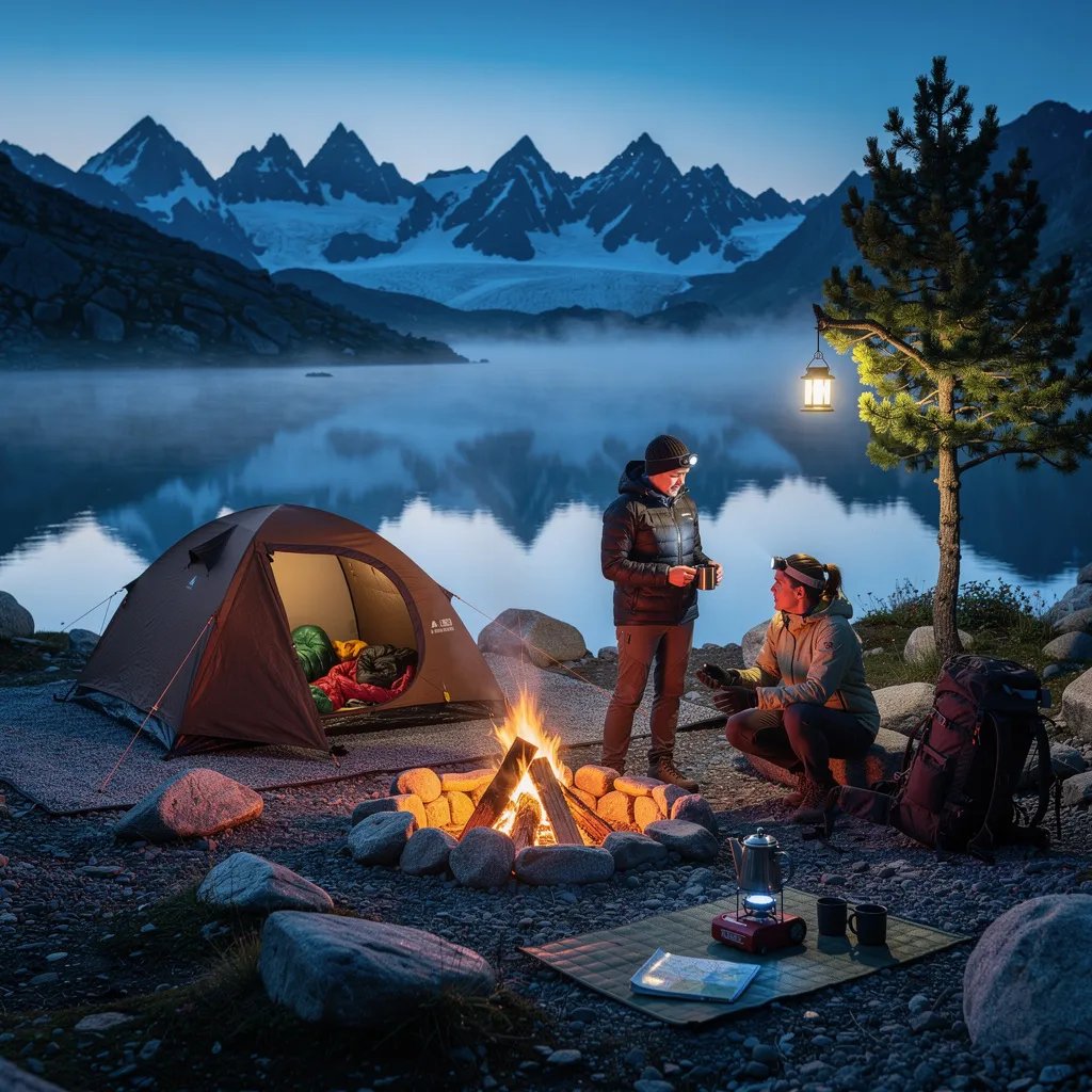 A quiet glacial lake sits under a cool blue twilight, with snowy peaks reflected like a mirror in the water. A brown tent rests on the rocky shore while a small campfire glows warm inside a circle of stones. Two hikers warm their hands as a lantern hangs from a pine branch and a coffee pot steams nearby.