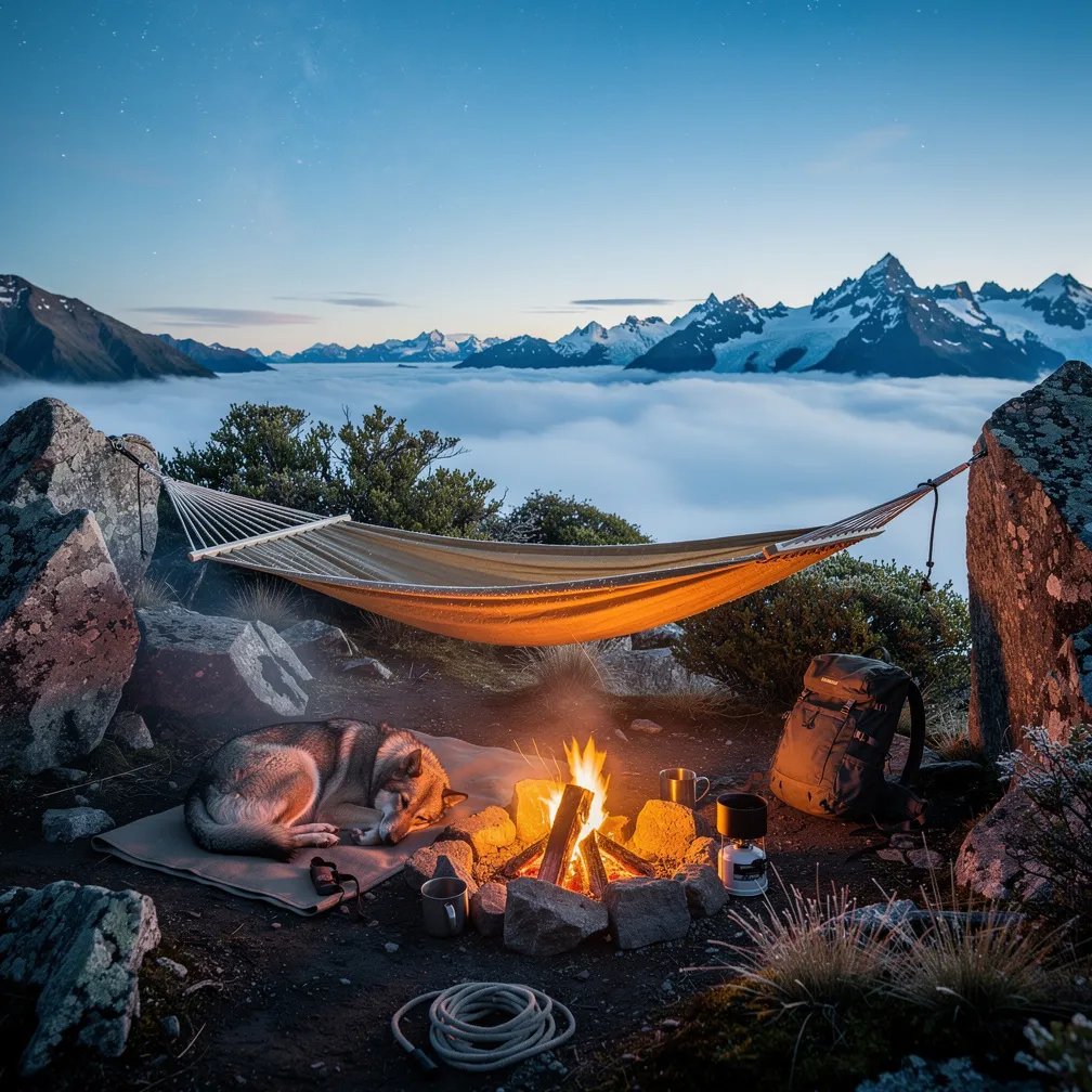 A tan hammock hangs low between rough rocks on a quiet alpine ridge. A small campfire glows in the blue dawn, and a sleepy dog curls up beside the warmth. Thin mist drifts across the stone slabs while stars fade above a fog-filled valley far below.