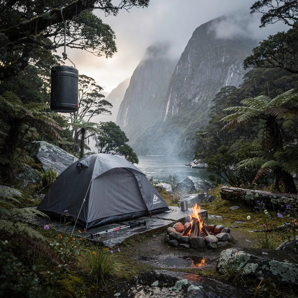 A dark dome tent sits on a wet stone slab in a quiet winter clearing. Mist drifts through the thick rainforest while fine sleet and rain make everything shine. A small campfire smolders in a ring of rocks, and a food canister hangs high from a tree by a rope.