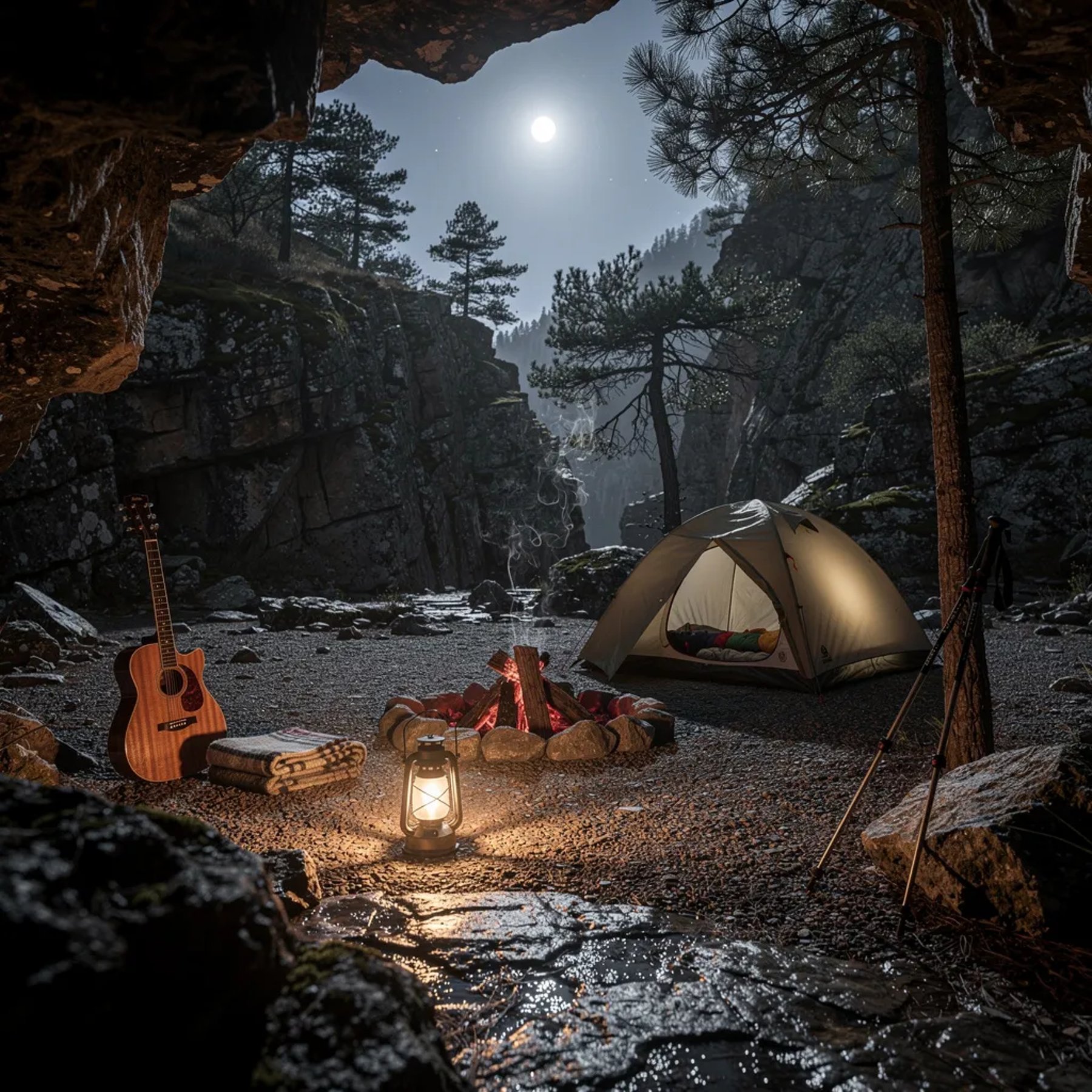 A rocky cave opens to a quiet campsite under a bright full moon. A khaki tent sits on gravel near a small fire with glowing embers, and a lantern shines warm light on the damp stones. A guitar and blanket rest nearby, while tall cliffs and a few pine trees stand in the misty night air. Far away, storm clouds flash with lightning on the horizon.