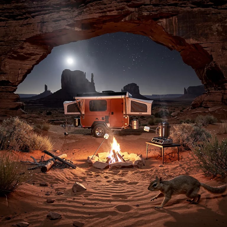 A worn sandstone arch frames a quiet desert camp in Monument Valley under a cool, silver moon. A burnt orange camper sits by a small fire, where marshmallows toast and warm light flickers on the sand and scrubby plants. A shiny coffee pot rests on a little stove, and a ground squirrel darts through the edge of the glow.