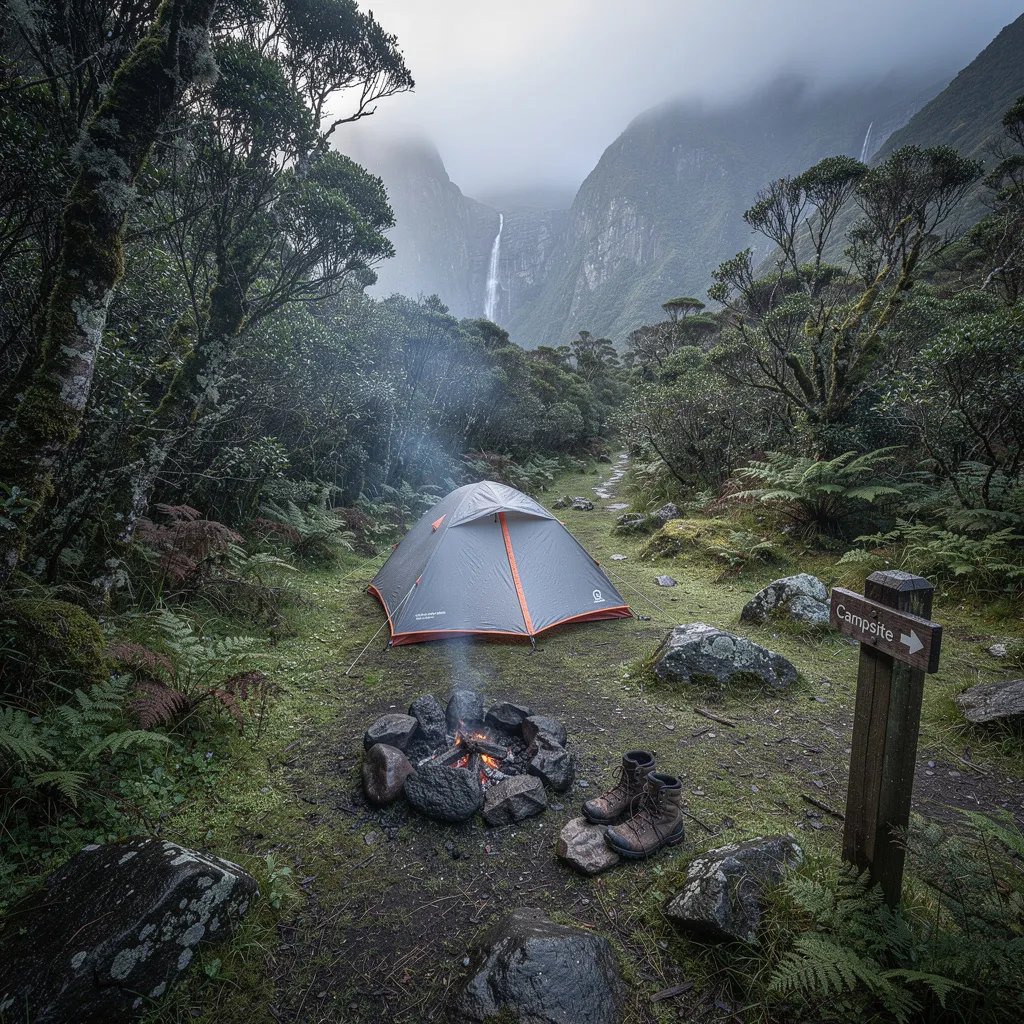 A misty morning fog drifts through a wet fern forest in Fiordland, with a rocky clearing below. In the middle sits a gray-and-orange tent, glowing softly in the cool dawn light. A tiny fire ring sends up a thin curl of smoke near a pair of hiking boots, and a wooden trail marker waits at the edge of camp.