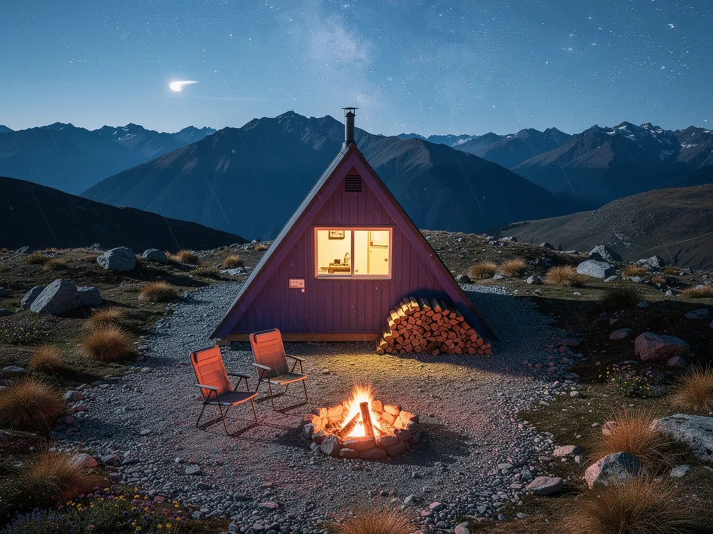A purple A-frame cabin sits on a rocky alpine ridge under a sky packed with bright stars and the Milky Way. A small campfire glows warm beside two empty chairs, with a tidy stack of firewood ready to burn. Cool moonlight shines on tussock grass and tiny wildflowers, while light snow flurries drift through the crisp night air.