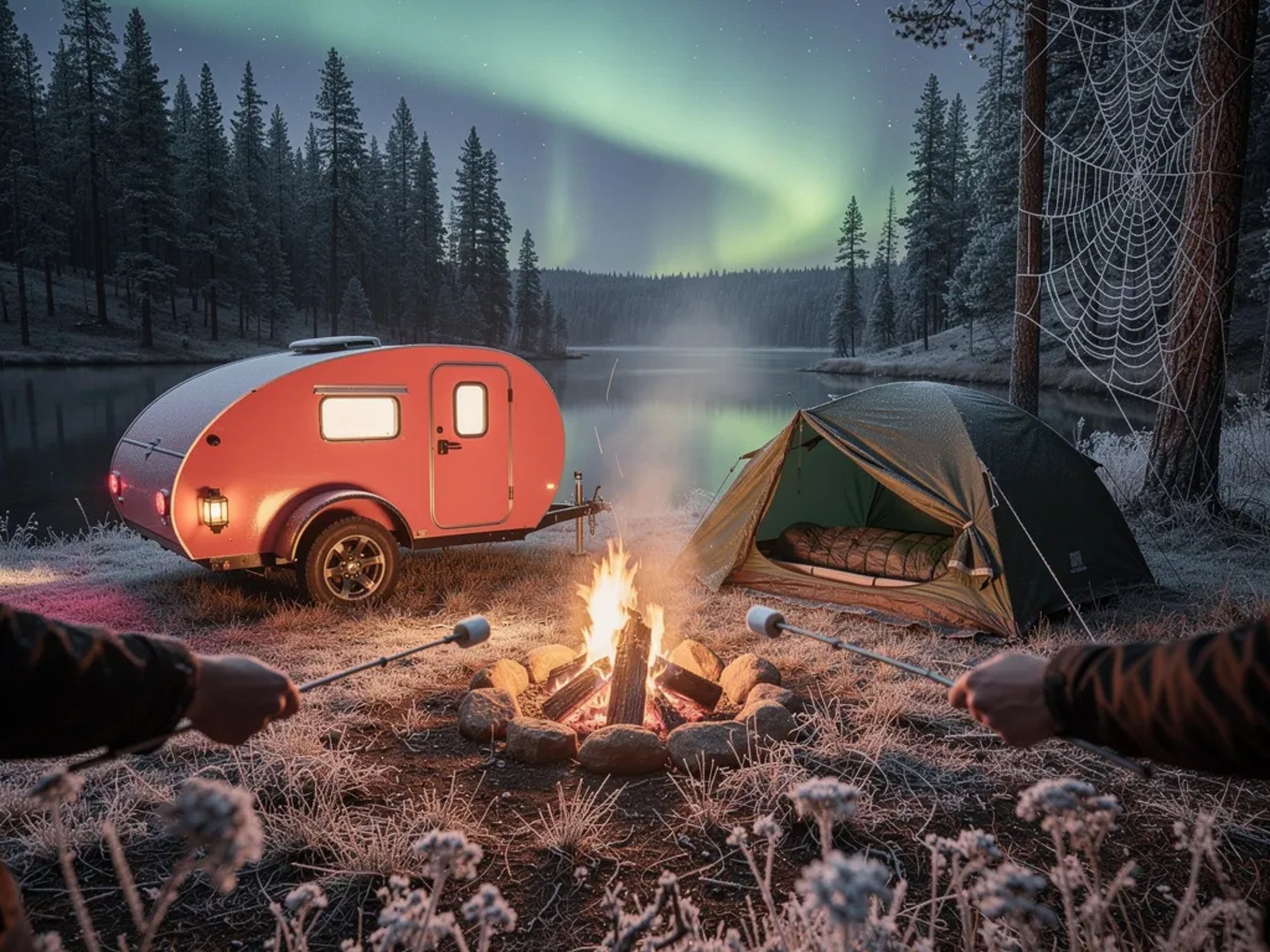 A cozy campsite sits in a quiet Montana forest beside a still, dark lake. A coral trailer and a small tent glow softly while a warm fire crackles and someone roasts marshmallows. Frost sparkles on a tiny spider web, and wildflowers peek up in the foreground. Above the tall pines, stars shine bright and a faint green aurora waves across the cold night sky.