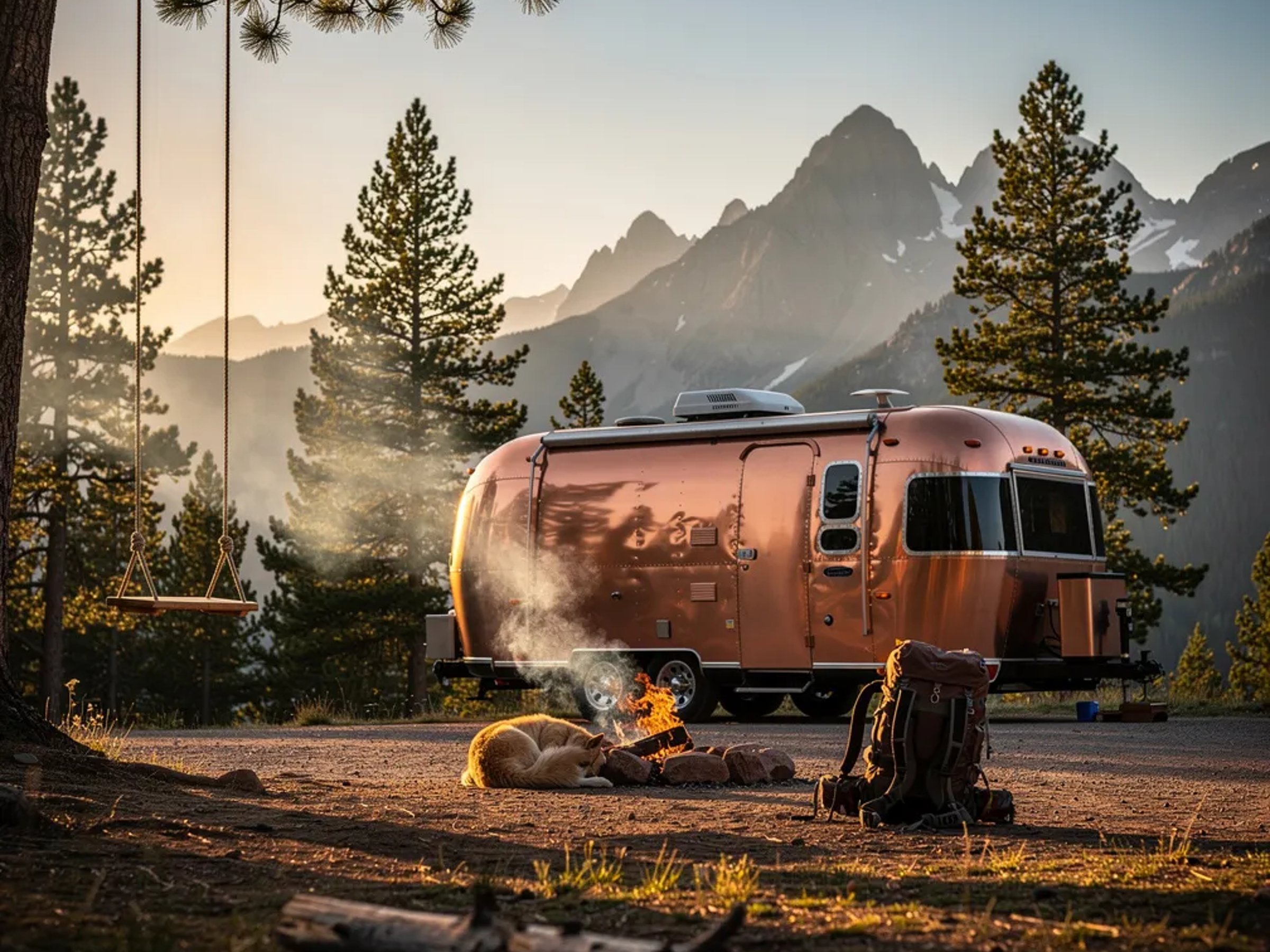 A shiny copper trailer sits in a quiet mountain clearing, with tall pine trees and rocky peaks in the distance. A small campfire glows and sends soft smoke into the cool evening air as a dog sleeps nearby. A rope swing hangs from a strong branch, and the sky is turning dusky with a bright star starting to show.